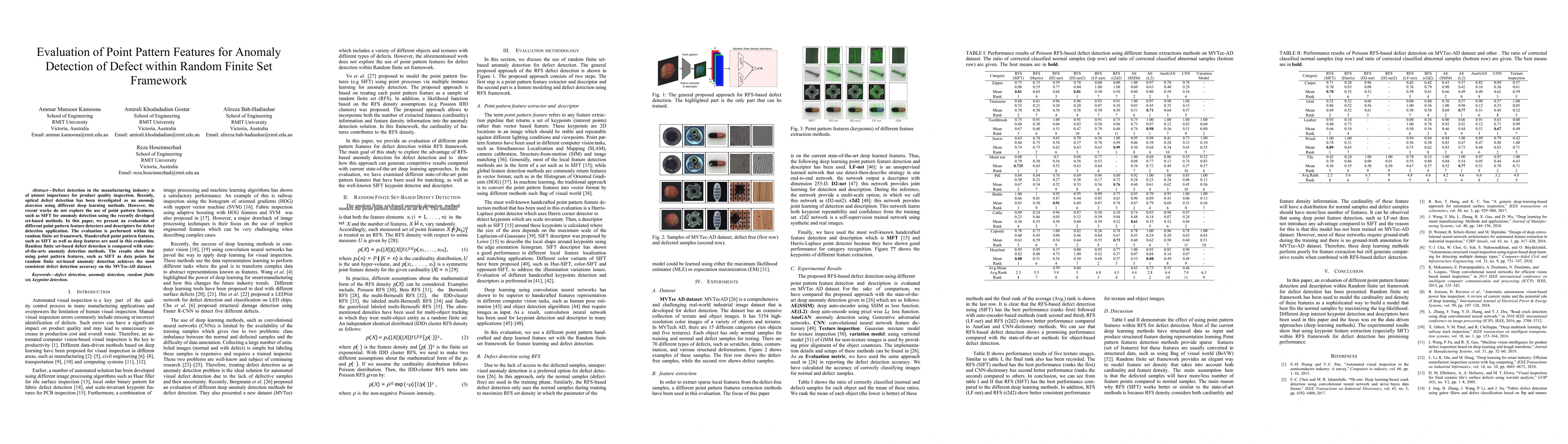 This paper evaluates the effectiveness of point pattern features, including SIFT, for defect detection in manufacturing using the random finite set framework. Results indicate that these handcrafted features outperform state-of-the-art methods in consistent anomaly detection accuracy on the MVTec-AD dataset.