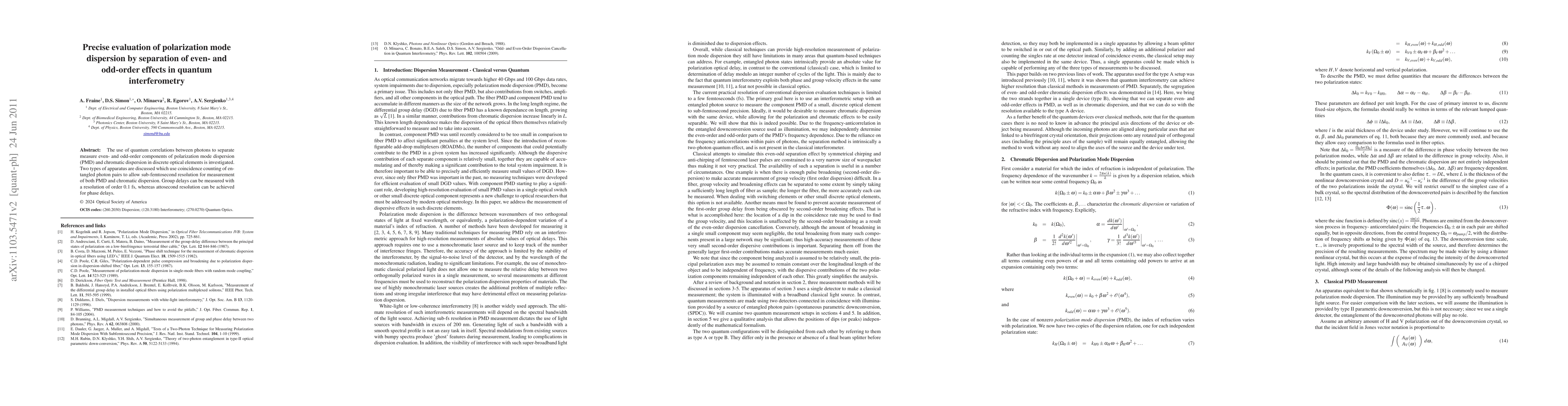 This paper evaluates the use of quantum interferometry to measure polarization mode dispersion and chromatic dispersion with high precision, utilizing entangled photon pairs for coincidence counting to achieve sub-femtosecond resolution and distinguish between even-order and odd-order chromatic effects.