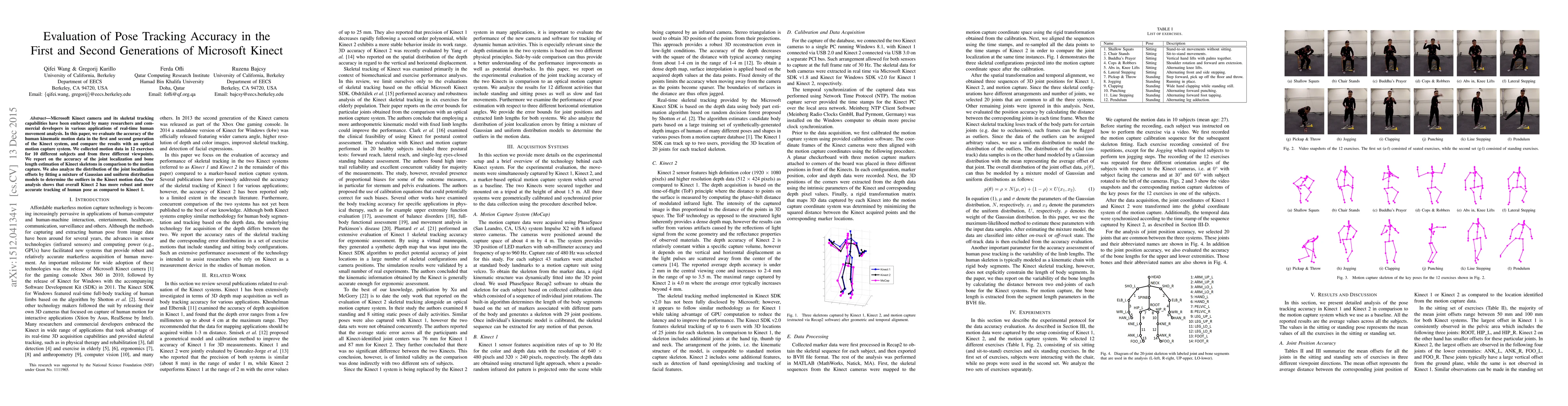 This paper evaluates the accuracy of human kinematic motion data from the first and second generations of Microsoft Kinect, comparing it to an optical motion capture system. Results show that Kinect 2 provides more robust and accurate pose tracking compared to Kinect 1, with a detailed analysis of joint localization and bone length estimation.