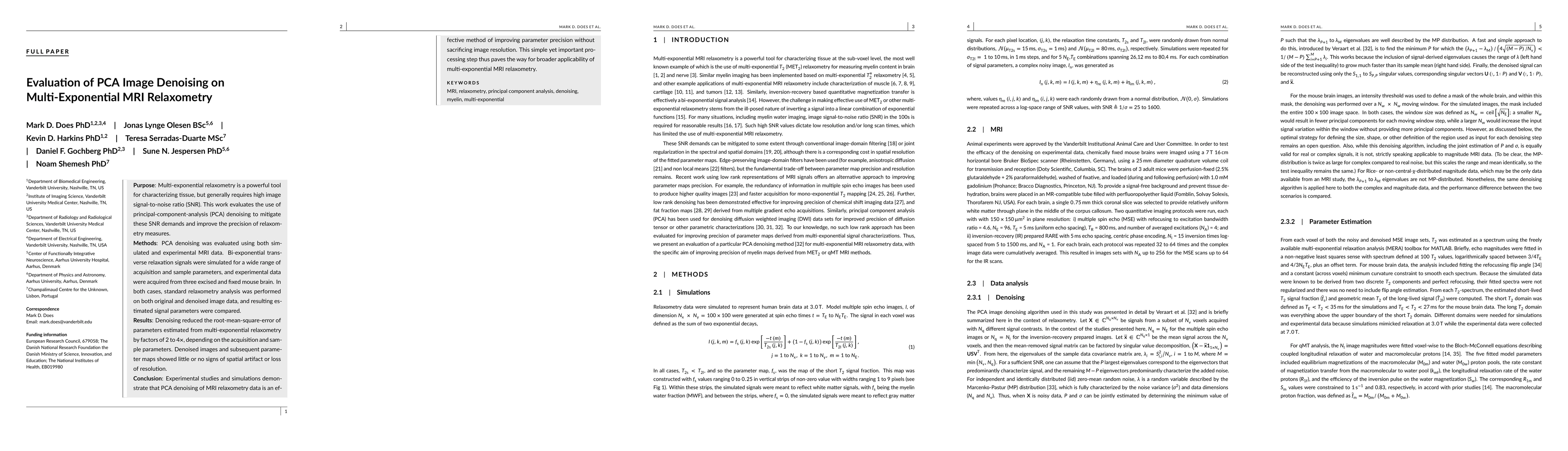 This study evaluates the effectiveness of PCA denoising in enhancing the precision of multi-exponential MRI relaxometry by reducing noise and improving signal parameters. Results show significant reductions in error and minimal artifacts, indicating PCA denoising's potential to broaden the application of this technique.