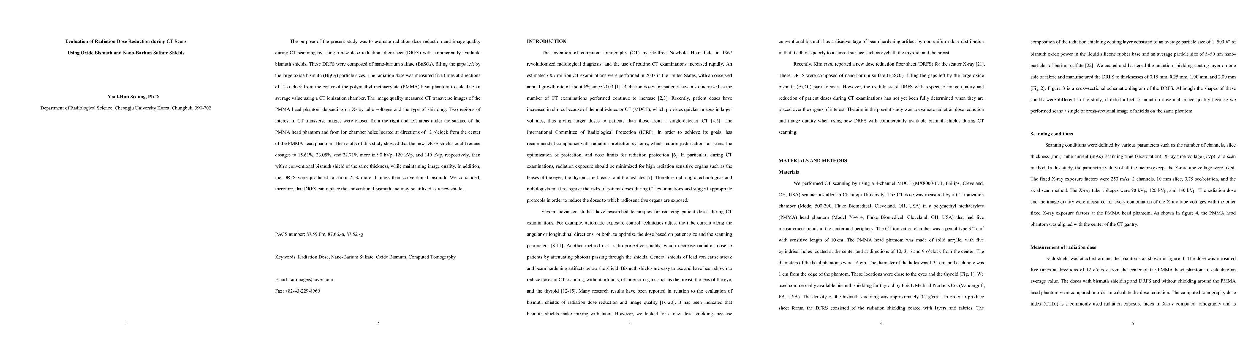 This study evaluated the effectiveness of a new dose reduction fiber sheet (DRFS) composed of nano-barium sulfate and oxide bismuth in reducing radiation dose during CT scans while maintaining image quality. Results showed significant dose reductions compared to conventional bismuth shields, suggesting DRFS as a potential replacement.