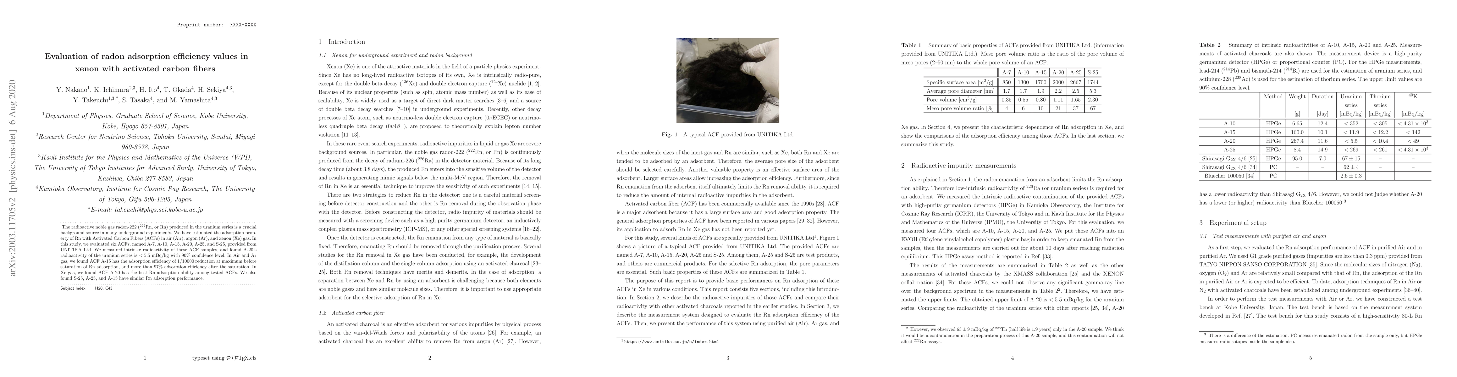 This study evaluates the radon adsorption efficiency of six activated carbon fibers (ACFs) in air, argon, and xenon gases. ACF A-20 shows the best radon adsorption performance in xenon, while ACF A-15 demonstrates high efficiency in air and argon, achieving over 97% adsorption after saturation.