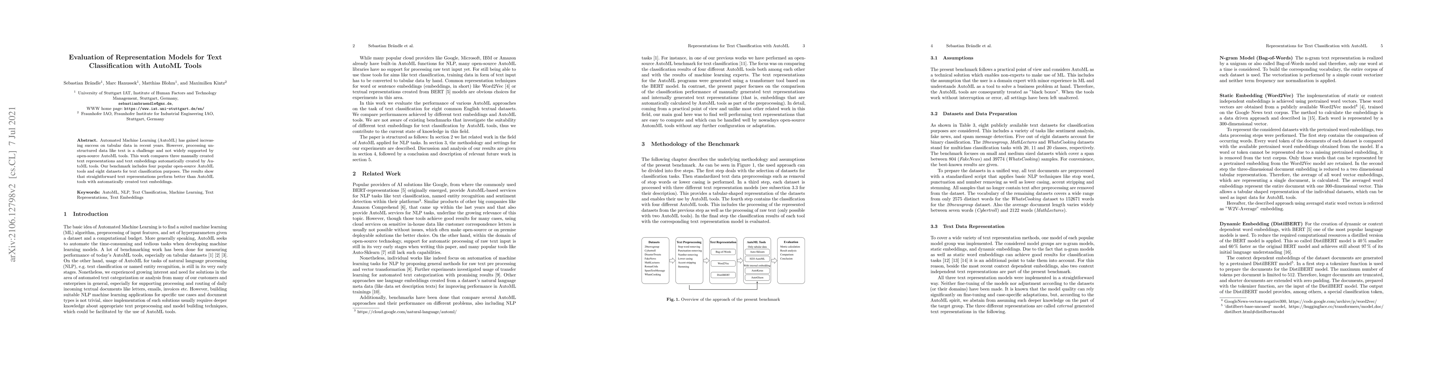 This study evaluates the effectiveness of representation models for text classification using AutoML tools, comparing manually created text representations with those generated by AutoML. Results indicate that manually crafted text representations outperform AutoML-generated embeddings across various datasets.