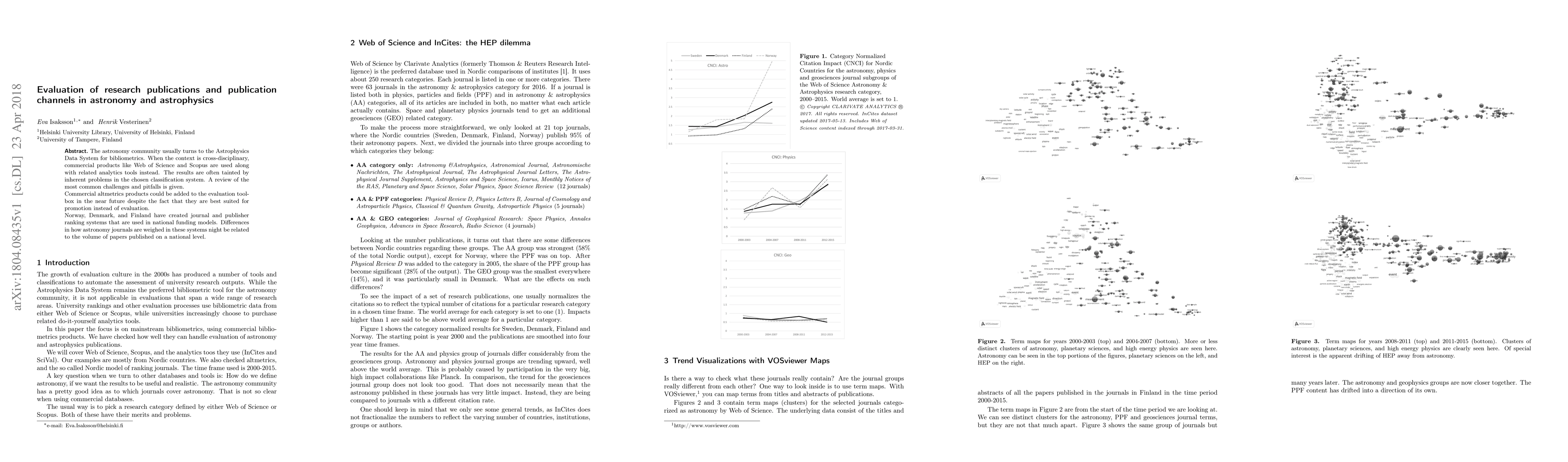 This paper evaluates the challenges in assessing research publications and channels in astronomy and astrophysics, highlighting issues with bibliometric tools like the Astrophysics Data System, Web of Science, and Scopus. It also discusses the potential integration of commercial altmetrics and notes the unique national ranking systems in Norway, Denmark, and Finland that affect funding models.