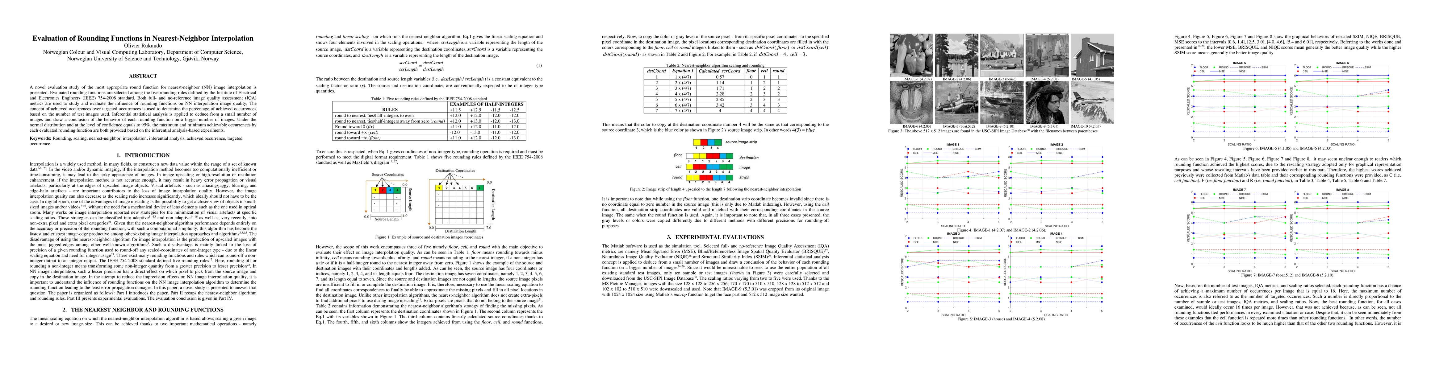 A novel evaluation study of the most appropriate round function for nearest-neighbor (NN) image interpolation is presented. Evaluated rounding functions are selected among the five rounding rules defined by the Institute of Electrical and Electronics Engineers (IEEE) 754-2008 standard. Both full- and no-reference image quality assessment (IQA) metrics are used to study and evaluate the influence of rounding functions on NN interpolation image quality. The concept of achieved occurrences over targeted occurrences is used to determine the percentage of achieved occurrences based on the number of test images used. Inferential statistical analysis is applied to deduce from a small number of images and draw a conclusion of the behavior of each rounding function on a bigger number of images. Under the normal distribution and at the level of confidence equals to 95%, the maximum and minimum achievable occurrences by each evaluated rounding function are both provided based on the inferential analysis-based experiments.