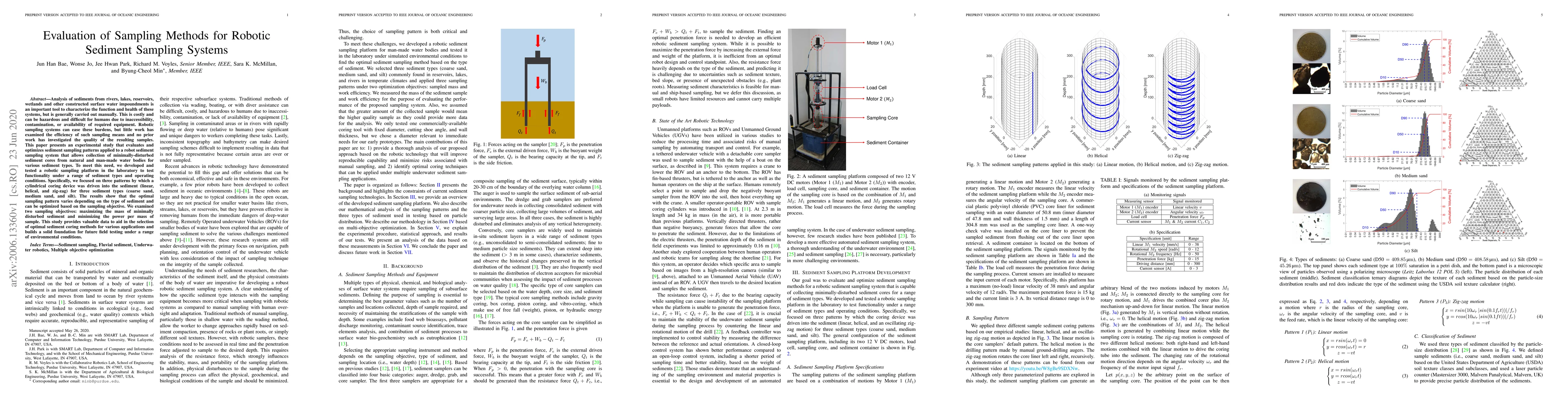 Analysis of sediments from rivers, lakes, reservoirs, wetlands and other constructed surface water impoundments is an important tool to characterize the function and health of these systems, but is generally carried out manually. This is costly and can be hazardous and difficult for humans due to inaccessibility, contamination, or availability of required equipment. Robotic sampling systems can ease these burdens, but little work has examined the efficiency of such sampling means and no prior work has investigated the quality of the resulting samples. This paper presents an experimental study that evaluates and optimizes sediment sampling patterns applied to a robot sediment sampling system that allows collection of minimally-disturbed sediment cores from natural and man-made water bodies for various sediment types. To meet this need, we developed and tested a robotic sampling platform in the laboratory to test functionality under a range of sediment types and operating conditions. Specifically, we focused on three patterns by which a cylindrical coring device was driven into the sediment (linear, helical, and zig-zag) for three sediment types (coarse sand, medium sand, and silt). The results show that the optimal sampling pattern varies depending on the type of sediment and can be optimized based on the sampling objective. We examined two sampling objectives: maximizing the mass of minimally disturbed sediment and minimizing the power per mass of sample. This study provides valuable data to aid in the selection of optimal sediment coring methods for various applications and builds a solid foundation for future field testing under a range of environmental conditions.