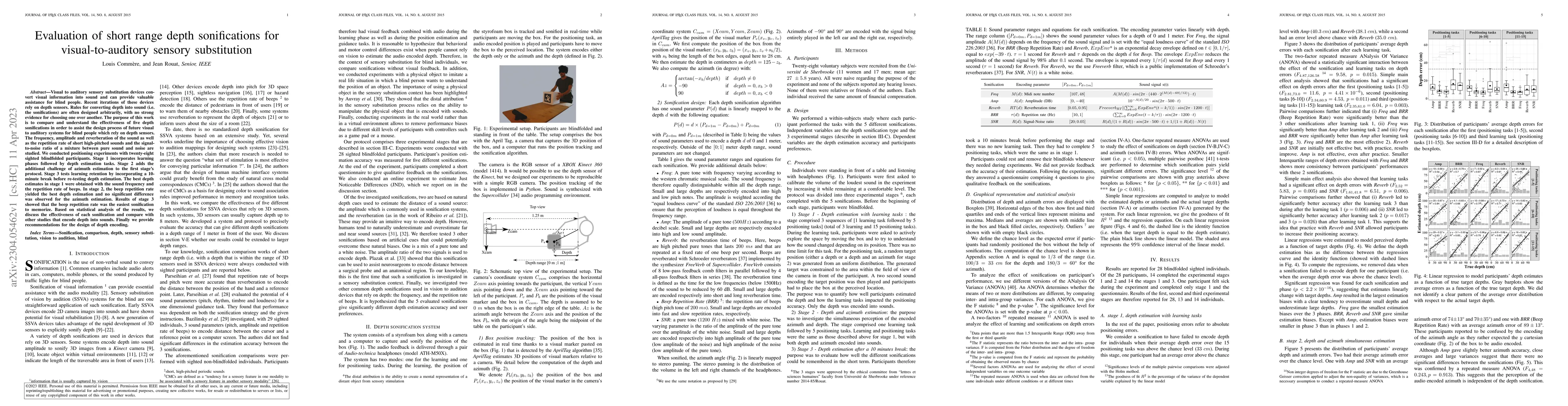 This study evaluates five depth sonifications for visual-to-auditory sensory substitution, finding that the repetition rate of high-pitched beeps is most effective for depth and azimuth estimation, as well as for learning retention. Recommendations for future depth encoding designs are provided based on the comparative analysis.
