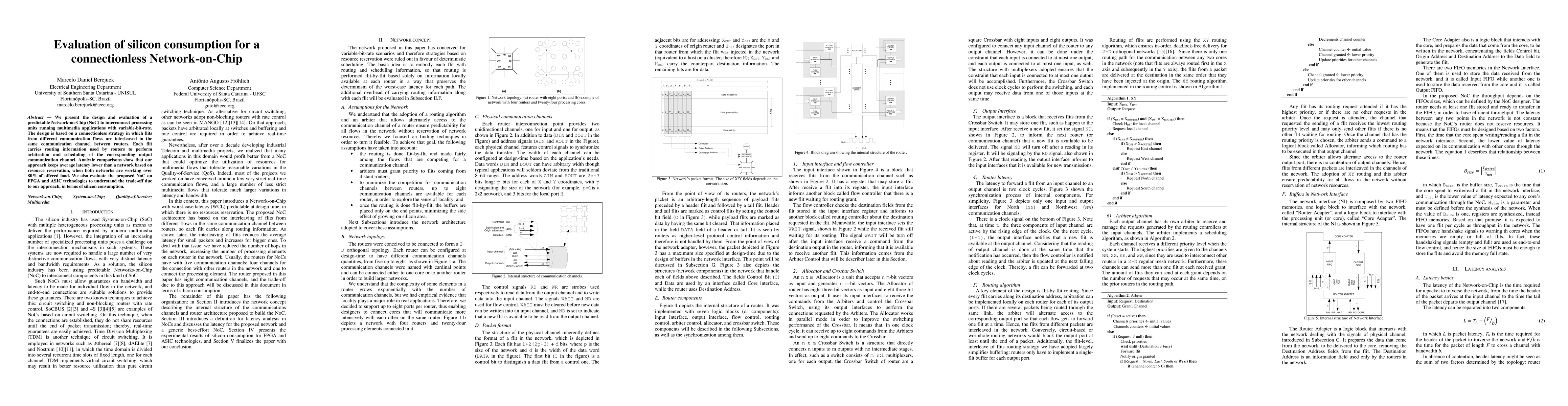 We present the design and evaluation of a predictable Network-on-Chip (NoC) to interconnect processing units running multimedia applications with variable-bit-rate. The design is based on a connectionless strategy in which flits from different communication flows are interleaved in the same communication channel between routers. Each flit carries routing information used by routers to perform arbitration and scheduling of the corresponding output communication channel. Analytic comparisons show that our approach keeps average latency lower than a network based on resource reservation, when both networks are working over 80% of offered load. We also evaluate the proposed NoC on FPGA and ASIC technologies to understand the trade-off due to our approach, in terms of silicon consumption.