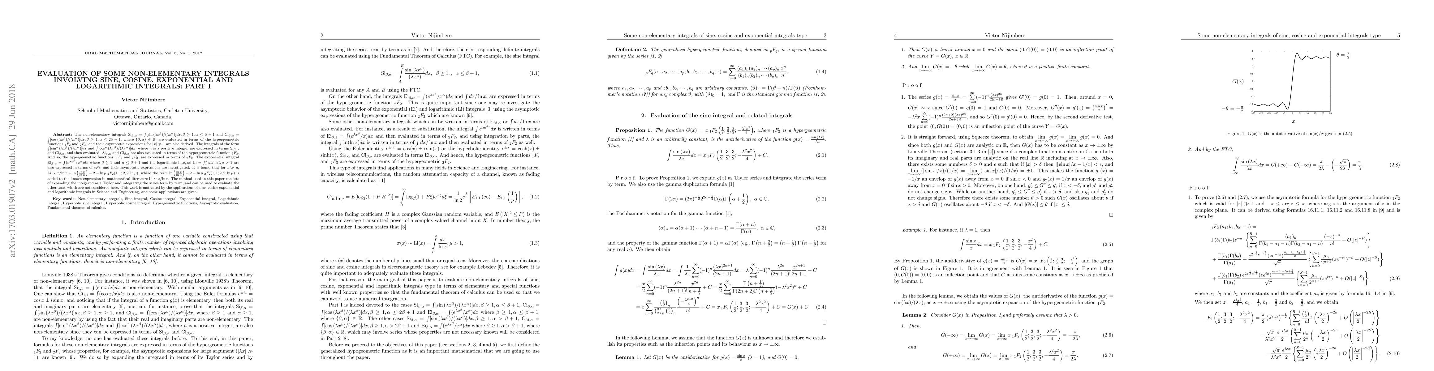 This paper evaluates non-elementary integrals involving sine, cosine, exponential, and logarithmic functions, expressing them in terms of hypergeometric functions $_{1}F_2$ and $_{2}F_3$. It also derives asymptotic expressions for these integrals and extends the evaluation to higher powers of sine and cosine.