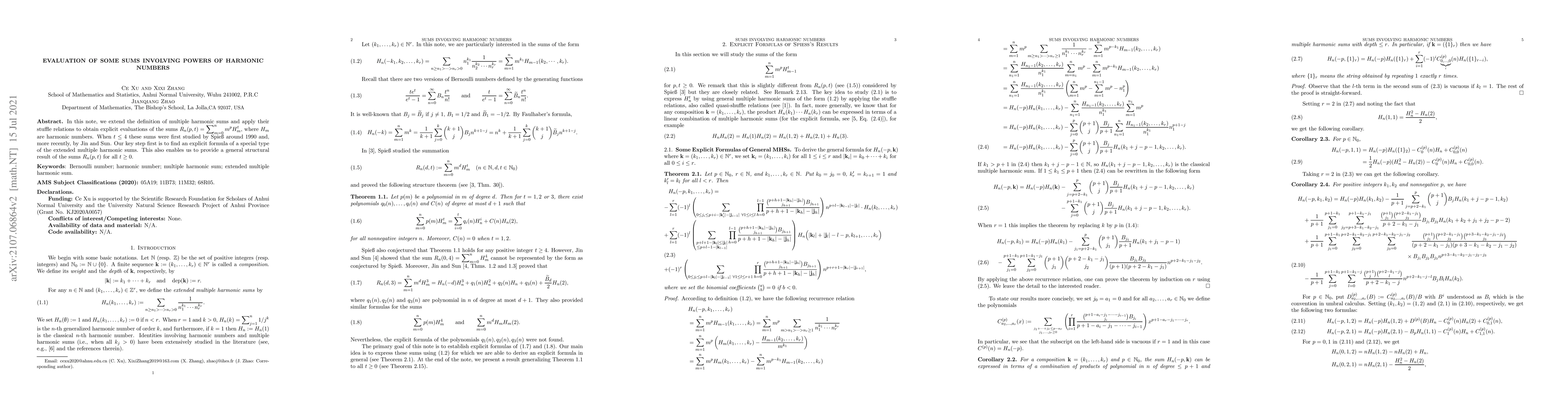 In this note, we extend the definition of multiple harmonic sums and apply their stuffle relations to obtain explicit evaluations of the sums $R_n(p,t)=\sum\nolimits_{m=0}^n m^p H_m^t$, where $H_m$ are harmonic numbers. When $t\le 4$ these sums were first studied by Spie\ss\ around 1990 and, more recently, by Jin and Sun. Our key step first is to find an explicit formula of a special type of the extended multiple harmonic sums. This also enables us to provide a general structural result of the sums $R_n(p,t)$ for all $t\ge 0$.