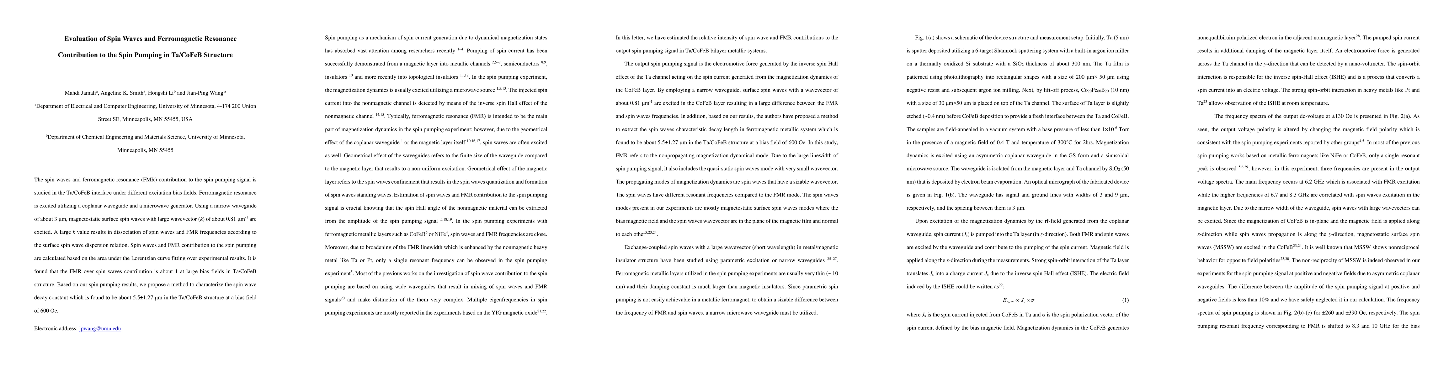 This study investigates the spin waves and ferromagnetic resonance contributions to spin pumping in Ta/CoFeB interfaces under varying excitation bias fields. The results show that ferromagnetic resonance dominates over spin waves at large bias fields, and a spin wave decay constant of approximately 5.5 μm is identified in the Ta/CoFeB structure at a bias field of 600 Oe.