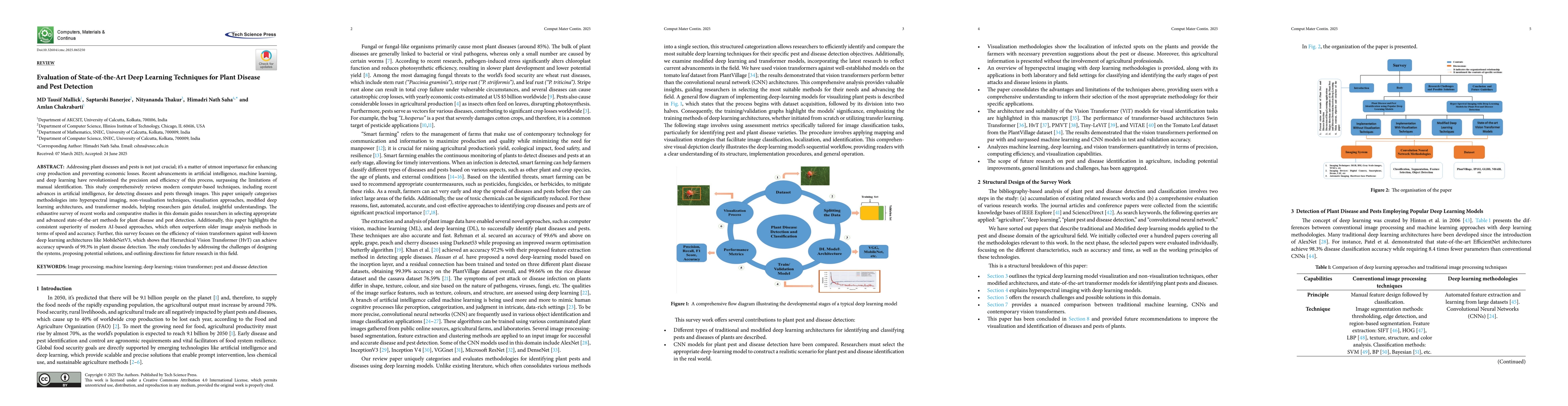 Addressing plant diseases and pests is critical for enhancing crop production and preventing economic losses. Recent advances in artificial intelligence (AI), machine learning (ML), and deep learning (DL) have significantly improved the precision and efficiency of detection methods, surpassing the limitations of manual identification. This study reviews modern computer-based techniques for detecting plant diseases and pests from images, including recent AI developments. The methodologies are organized into five categories: hyperspectral imaging, non-visualization techniques, visualization approaches, modified deep learning architectures, and transformer models. This structured taxonomy provides researchers with detailed, actionable insights for selecting advanced state-of-the-art detection methods. A comprehensive survey of recent work and comparative studies demonstrates the consistent superiority of modern AI-based approaches, which often outperform older image analysis methods in speed and accuracy. In particular, vision transformers such as the Hierarchical Vision Transformer (HvT) have shown accuracy exceeding 99.3% in plant disease detection, outperforming architectures like MobileNetV3. The study concludes by discussing system design challenges, proposing solutions, and outlining promising directions for future research.