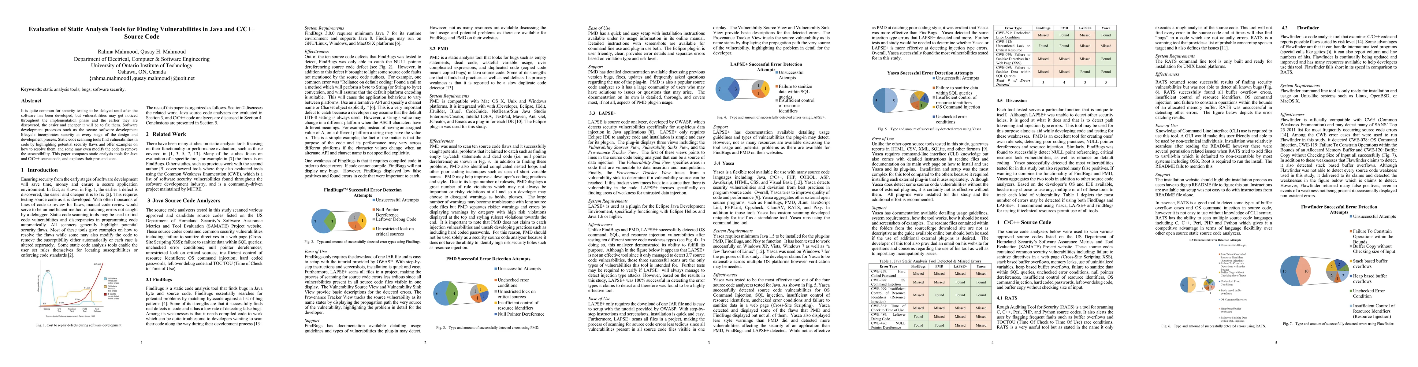 This paper evaluates static analysis tools for identifying vulnerabilities in Java and C/C++ source code, emphasizing their effectiveness and drawbacks. It highlights the importance of integrating security early in the software development lifecycle to facilitate easier and less costly remediation.