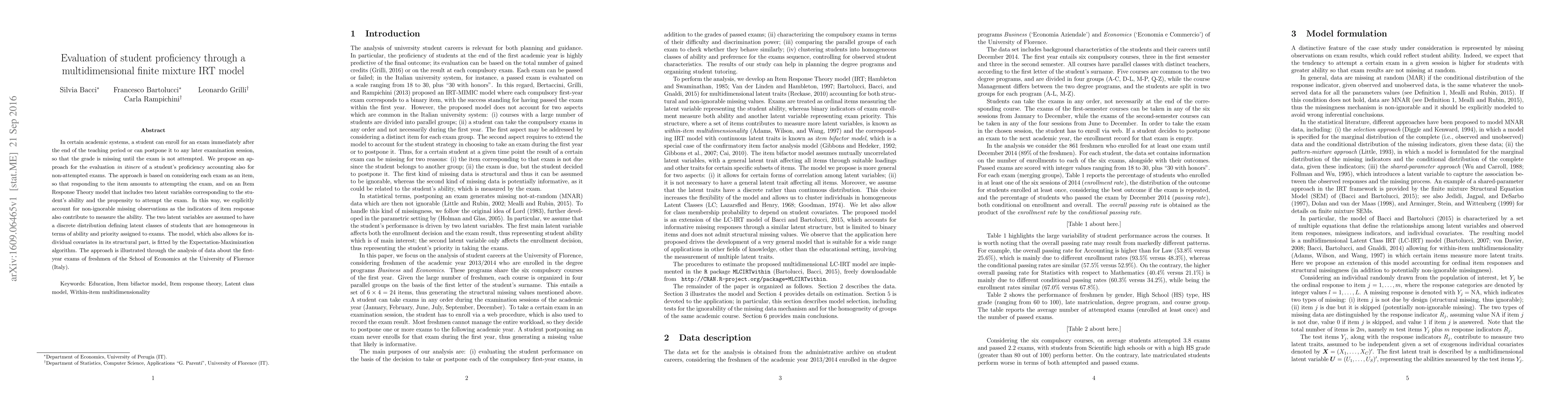 In certain academic systems, a student can enroll for an exam immediately after the end of the teaching period or can postpone it to any later examination session, so that the grade is missing until the exam is not attempted. We propose an approach for the evaluation in itinere of a student's proficiency accounting also for non-attempted exams. The approach is based on considering each exam as an item, so that responding to the item amounts to attempting the exam, and on an Item Response Theory model that includes two latent variables corresponding to the student's ability and the propensity to attempt the exam. In this way, we explicitly account for non-ignorable missing observations as the indicators of item response also contribute to measure the ability. The two latent variables are assumed to have a discrete distribution defining latent classes of students that are homogeneous in terms of ability and priority assigned to exams. The model, which also allows for individual covariates in its structural part, is fitted by the Expectation-Maximization algorithm. The approach is illustrated through the analysis of data about the first-year exams of freshmen of the School of Economics at the University of Florence (Italy).