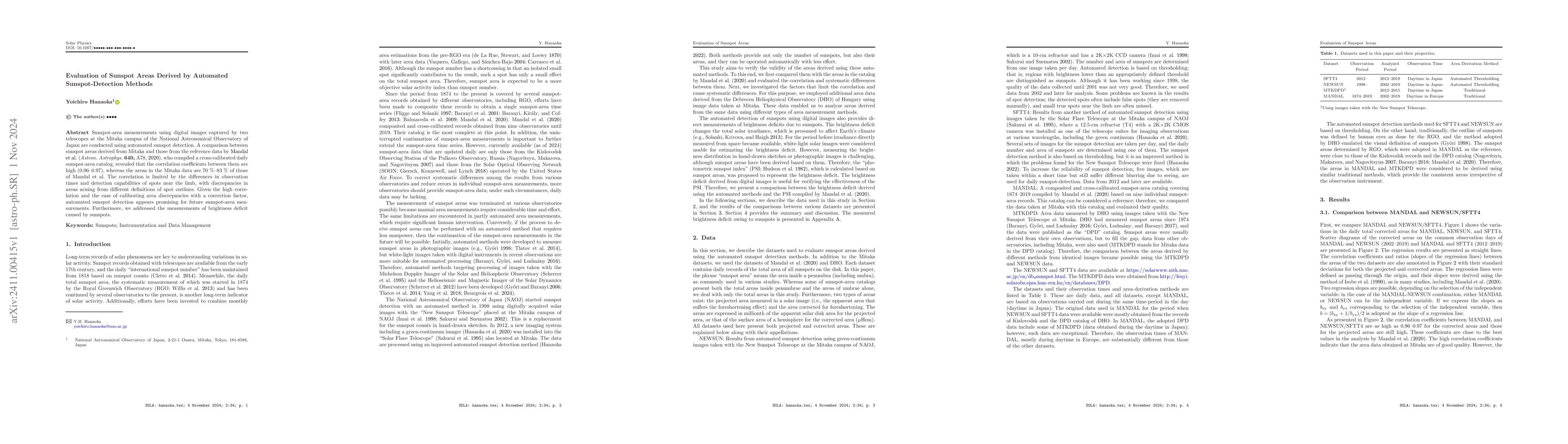 The paper evaluates sunspot-area measurements from automated detection methods using data from two telescopes, finding high correlation (0.96--0.97) with a reference catalog despite discrepancies due to differences in observation times and spot detection near the solar limb. The study concludes that automated methods are promising with potential for calibration.