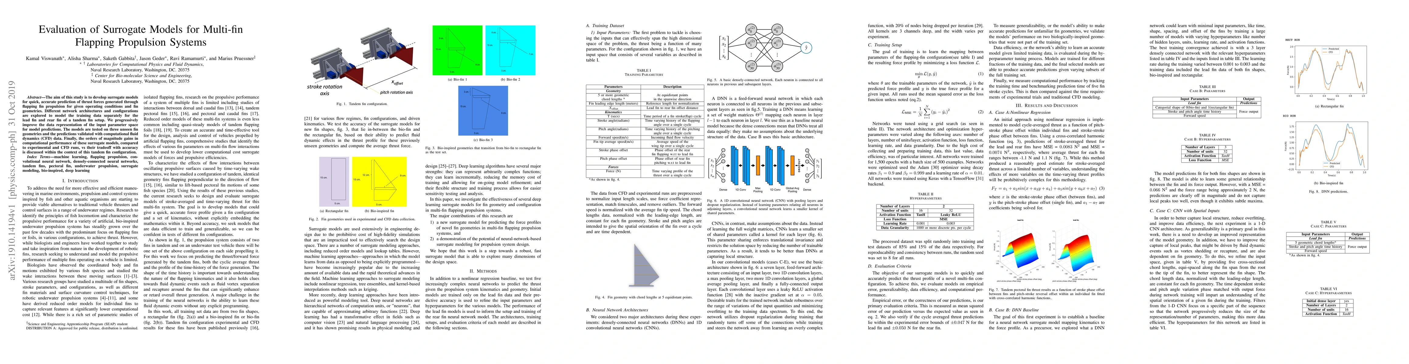 The aim of this study is to develop surrogate models for quick, accurate prediction of thrust forces generated through flapping fin propulsion for given operating conditions and fin geometries. Different network architectures and configurations are explored to model the training data separately for the lead fin and rear fin of a tandem fin setup. We progressively improve the data representation of the input parameter space for model predictions. The models are tested on three unseen fin geometries and the predictions validated with computational fluid dynamics (CFD) data. Finally, the orders of magnitude gains in computational performance of these surrogate models, compared to experimental and CFD runs, vs their tradeoff with accuracy is discussed within the context of this tandem fin configuration.