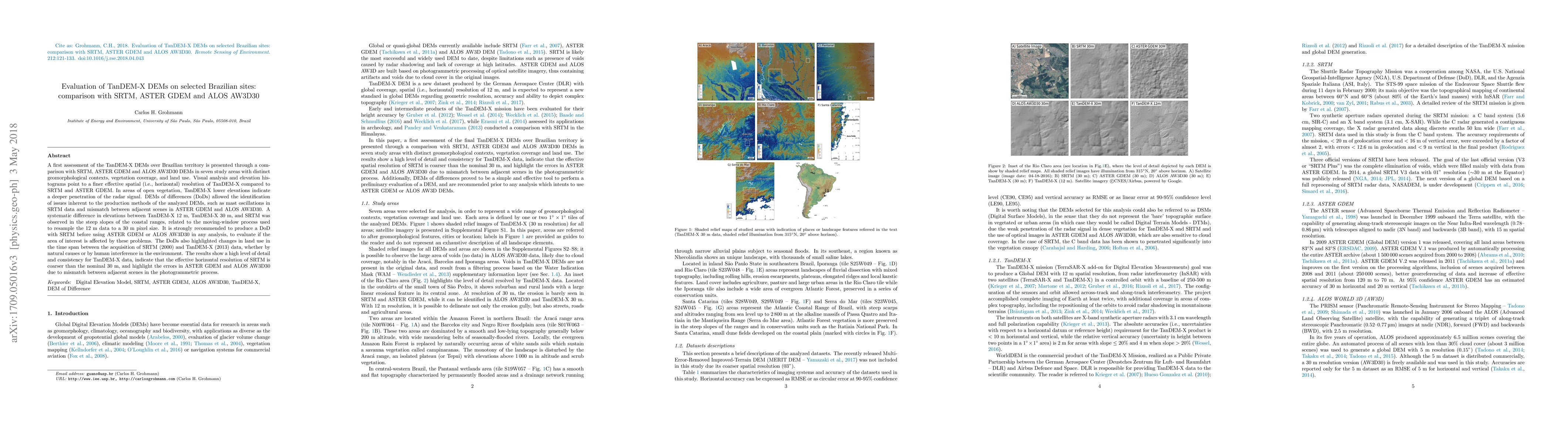 This study compares TanDEM-X Digital Elevation Models (DEMs) with SRTM, ASTER GDEM, and ALOS AW3D30 in seven Brazilian areas. Key findings include TanDEM-X's finer spatial resolution, better radar signal penetration in open vegetation, and identified issues like mast oscillations in SRTM and scene mismatches in ASTER GDEM and ALOS AW3D30. A systematic elevation difference was observed between TanDEM-X 12m, TanDEM-X 30m, and SRTM on steep coastal ranges. The research recommends creating a SRTM-based DoD before using ASTER GDEM or ALOS AW3D30 for analysis, as these highlight land use changes between SRTM (2000) and TanDEM-X (2013) data.