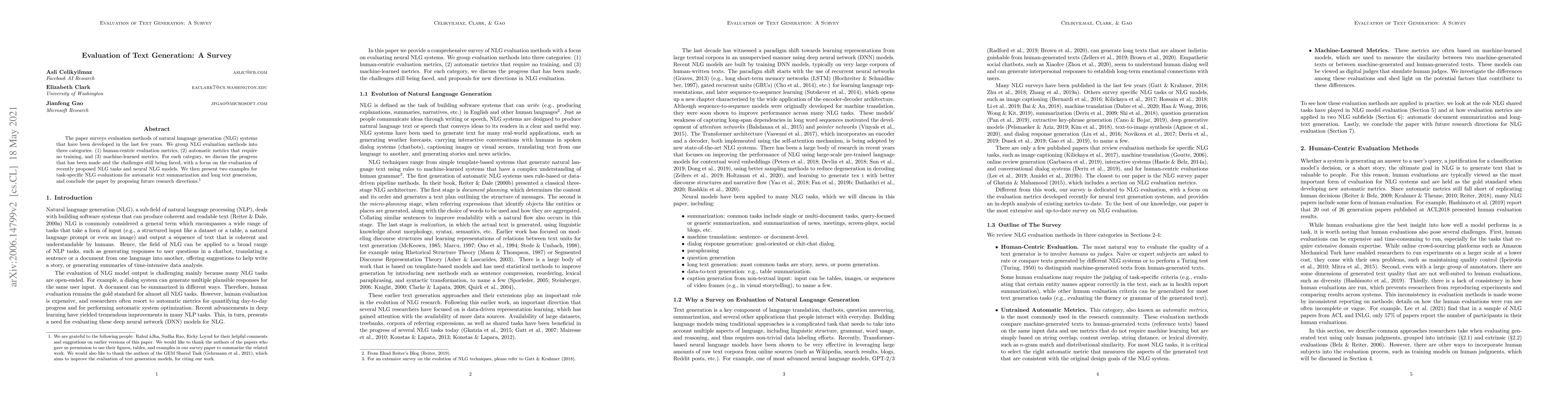 This paper surveys recent evaluation methods for natural language generation (NLG) systems, categorizing them into human-centric, automatic, and machine-learned metrics. It highlights advancements and challenges in evaluating neural NLG models and proposes future research directions.