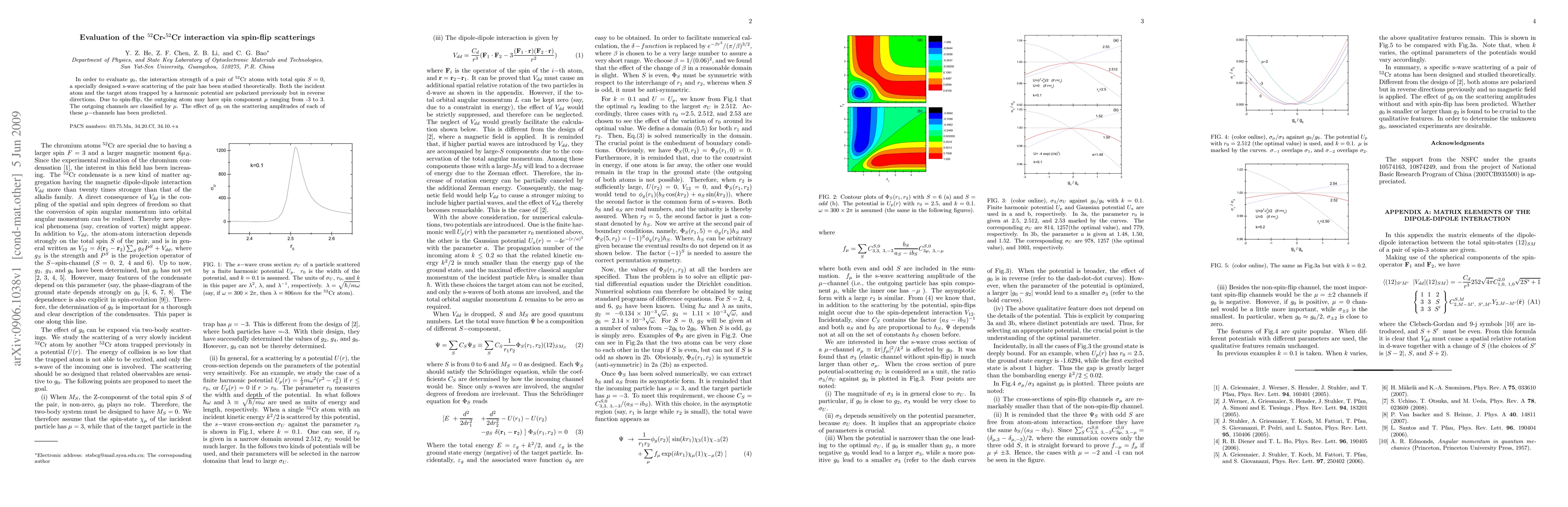 In order to evaluate $g_0$, the interaction strength of a pair of $^{52}$Cr atoms with total spin S=0, a specially designed s-wave scattering of the pair has been studied theoretically. Both the incident atom and the target atom trapped by a harmonic potential are polarized previously but in reverse directions. Due to spin-flip, the outgoing atom may have spin component $\mu$ ranging from -3 to 3. The outgoing channels are classified by $\mu$. The effect of $g_{0}$ on the scattering amplitudes of each of these $\mu-$channels has been predicted.