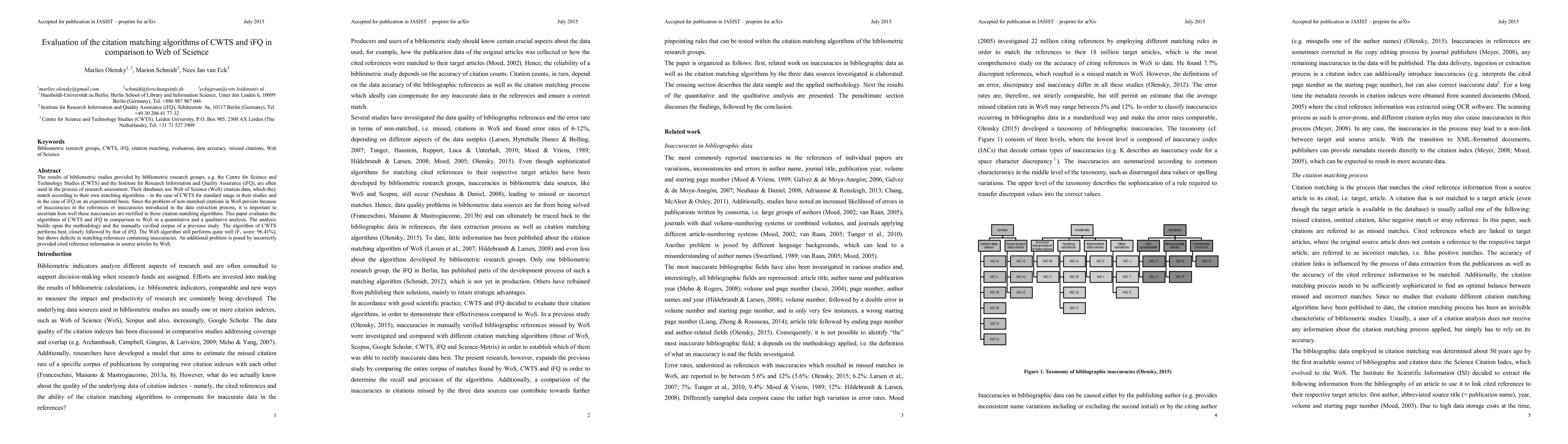 This study compares the citation matching algorithms of CWTS, iFQ, and Web of Science, finding that CWTS performs best, followed closely by iFQ, while WoS shows deficits in matching references with inaccuracies.