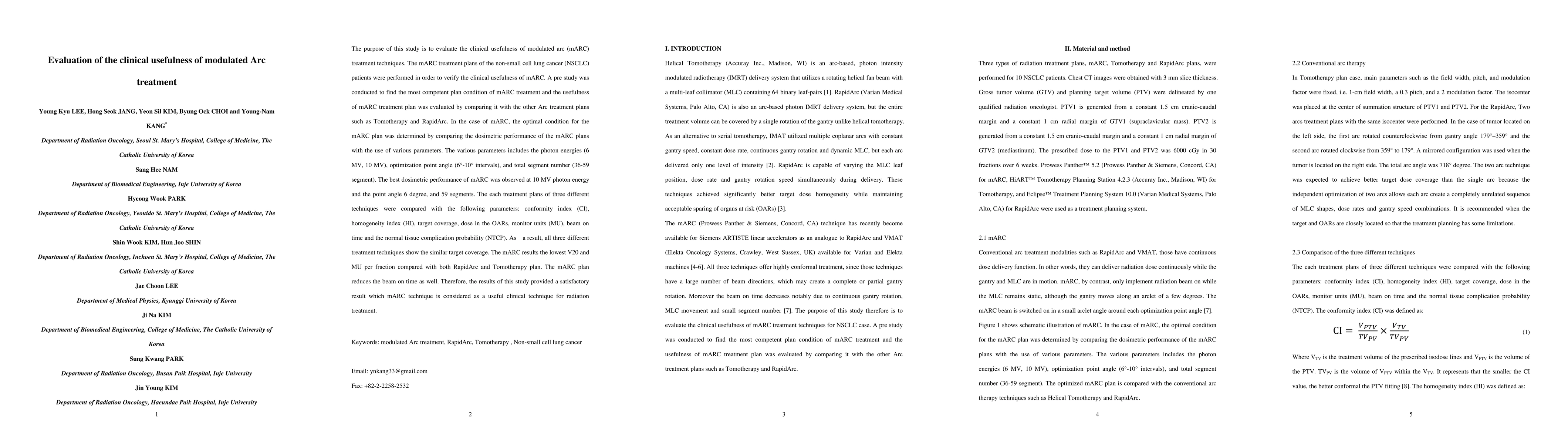 The purpose of this study is to evaluate the clinical usefulness of modulated arc (mARC) treatment techniques. The mARC treatment plans of the non-small cell lung cancer (NSCLC) patients were performed in order to verify the clinical usefulness of mARC. A pre study was conducted to find the most competent plan condition of mARC treatment and the usefulness of mARC treatment plan was evaluated by comparing it with the other Arc treatment plans such as Tomotherapy and RapidArc. In the case of mARC, the optimal condition for the mARC plan was determined by comparing the dosimetric performance of the mARC plans with the use of various parameters. The various parameters includes the photon energies (6 MV, 10 MV), optimization point angle (6{\deg}-10{\deg} intervals), and total segment number (36-59 segment). The best dosimetric performance of mARC was observed at 10 MV photon energy and the point angle 6 degree, and 59 segments. The each treatment plans of three different techniques were compared with the following parameters: conformity index (CI), homogeneity index (HI), target coverage, dose in the OARs, monitor units (MU), beam on time and the normal tissue complication probability (NTCP). As a result, all three different treatment techniques show the similar target coverage. The mARC results the lowest V20 and MU per fraction compared with both RapidArc and Tomotherapy plan. The mARC plan reduces the beam on time as well. Therefore, the results of this study provided a satisfactory result which mARC technique is considered as a useful clinical technique for radiation treatment.