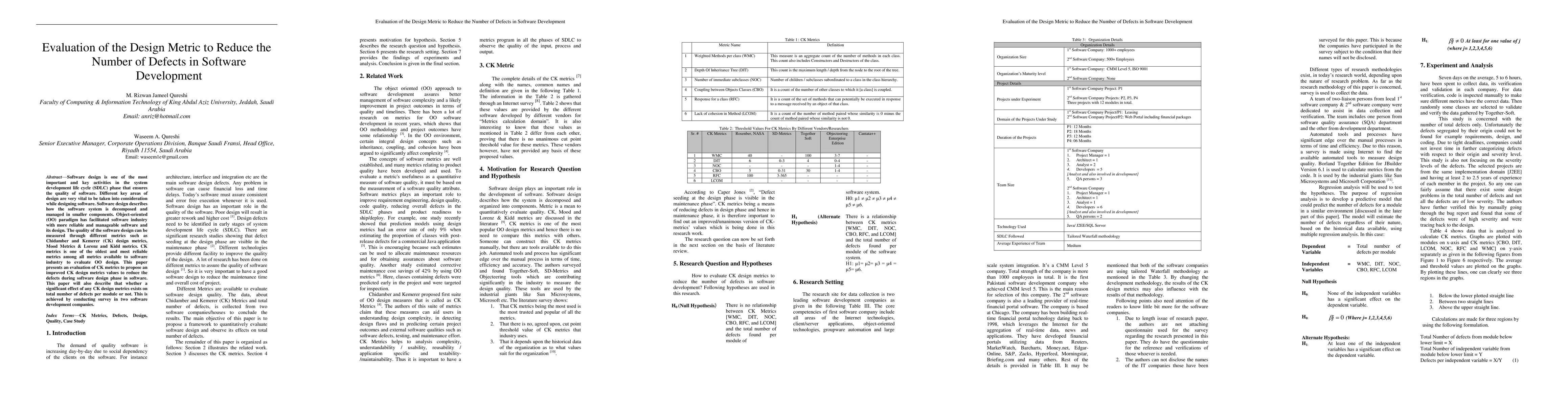 This study evaluates Chidamber and Kemerer (CK) design metrics to propose improved values for reducing software defects during the design phase. It finds a significant effect of certain CK metrics on the total number of defects per module.