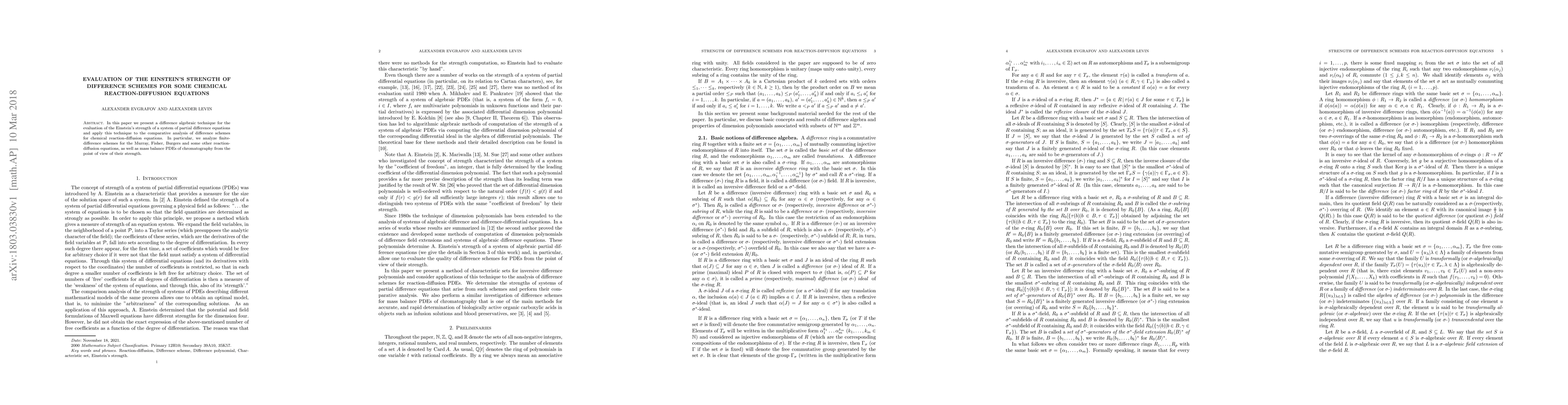 In this paper we present a difference algebraic technique for the evaluation of the Einstein's strength of a system of partial difference equations and apply this technique to the comparative analysis of difference schemes for chemical reaction-diffusion equations. In particular, we analyze finite-difference schemes for the Murray, Fisher, Burgers and some other reaction-diffusion equations, as well as mass balance PDEs of chromatography from the point of view of their strength.