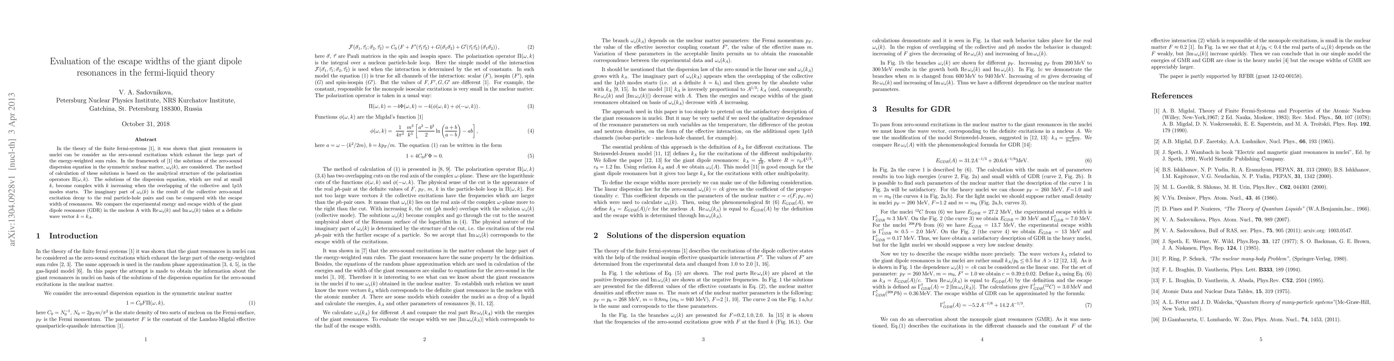 The paper presents a method for evaluating the escape widths of giant dipole resonances in nuclei using Fermi-liquid theory, linking theoretical zero-sound excitations to experimental escape widths.