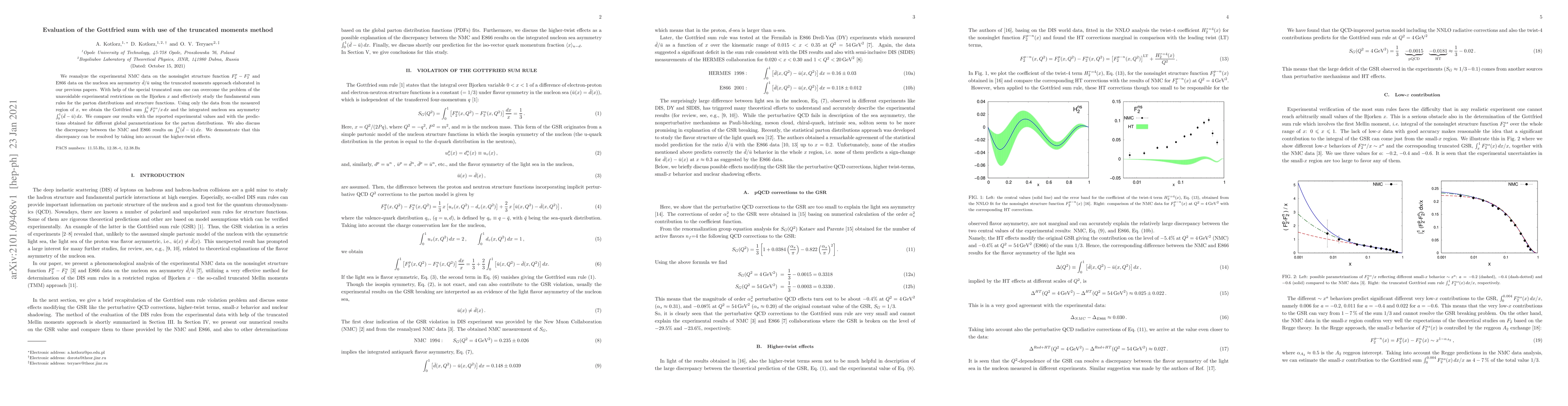 We reanalyze the experimental NMC data on the nonsinglet structure function $F_2^p-F_2^n$ and E866 data on the nucleon sea asymmetry $\bar{d}/\bar{u}$ using the truncated moments approach elaborated in our previous papers. With help of the special truncated sum one can overcome the problem of the unavoidable experimental restrictions on the Bjorken $x$ and effectively study the fundamental sum rules for the parton distributions and structure functions. Using only the data from the measured region of $x$, we obtain the Gottfried sum $\int_0^1 F_2^{ns}/x\, dx$ and the integrated nucleon sea asymmetry $\int_0^1 (\bar{d}-\bar{u})\, dx$. We compare our results with the reported experimental values and with the predictions obtained for different global parametrizations for the parton distributions. We also discuss the discrepancy between the NMC and E866 results on $\int_0^1 (\bar{d}-\bar{u})\, dx$. We demonstrate that this discrepancy can be resolved by taking into account the higher-twist effects.