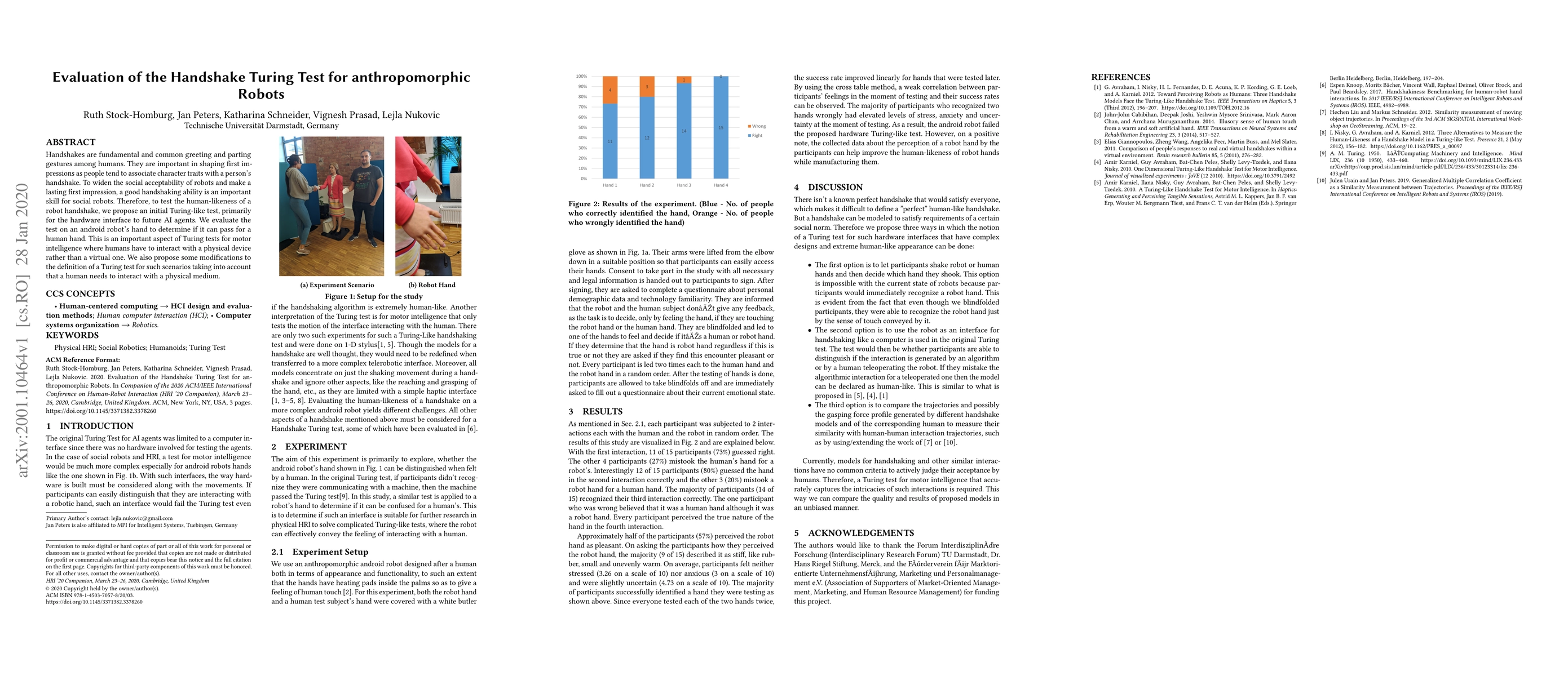 This paper proposes a Handshake Turing Test to evaluate the human-likeness of anthropomorphic robots' handshaking abilities, aiming to enhance social acceptability. The study assesses an android robot's hand to determine if it can convincingly mimic a human handshake, suggesting modifications to traditional Turing tests for physical interactions.