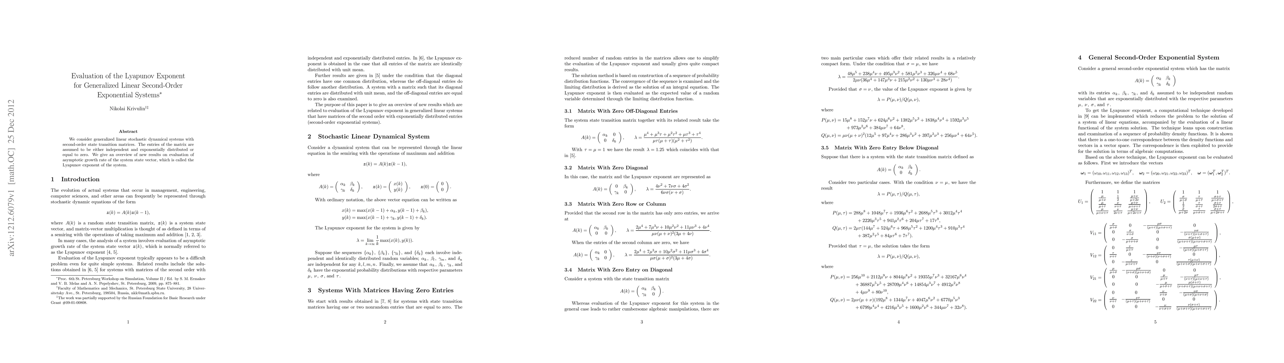 We consider generalized linear stochastic dynamical systems with second-order state transition matrices. The entries of the matrix are assumed to be either independent and exponentially distributed or equal to zero. We give an overview of new results on evaluation of asymptotic growth rate of the system state vector, which is called the Lyapunov exponent of the system.