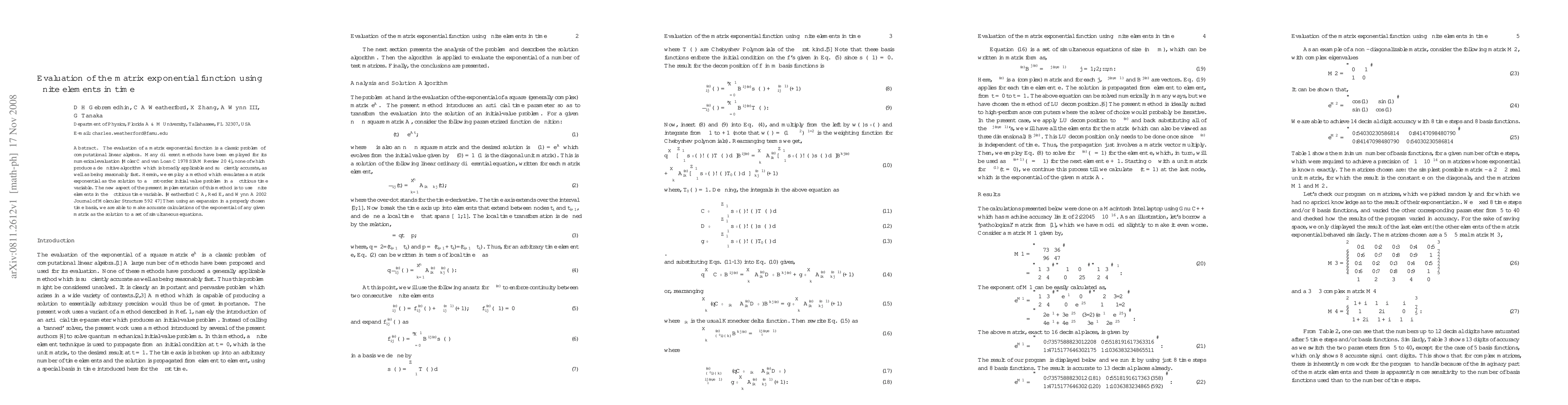 This paper evaluates the matrix exponential function using finite elements in a fictitious time variable, transforming the problem into a first-order initial value problem. The method employs a time basis expansion to achieve accurate and efficient calculations.