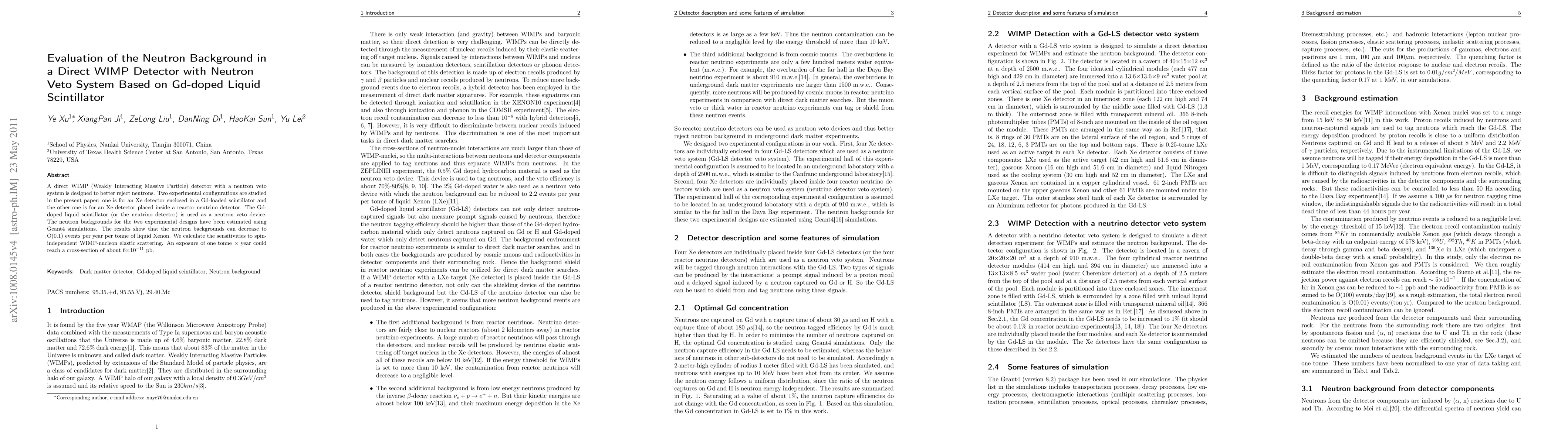 This paper evaluates neutron backgrounds in direct WIMP detectors using Gd-doped liquid scintillator as a neutron veto system. Simulations show that neutron backgrounds can be reduced to O(0.1) events per year per tonne of liquid Xenon, achieving a WIMP-nucleon cross-section sensitivity of 6×10^-11 pb with a one-tonne year exposure.