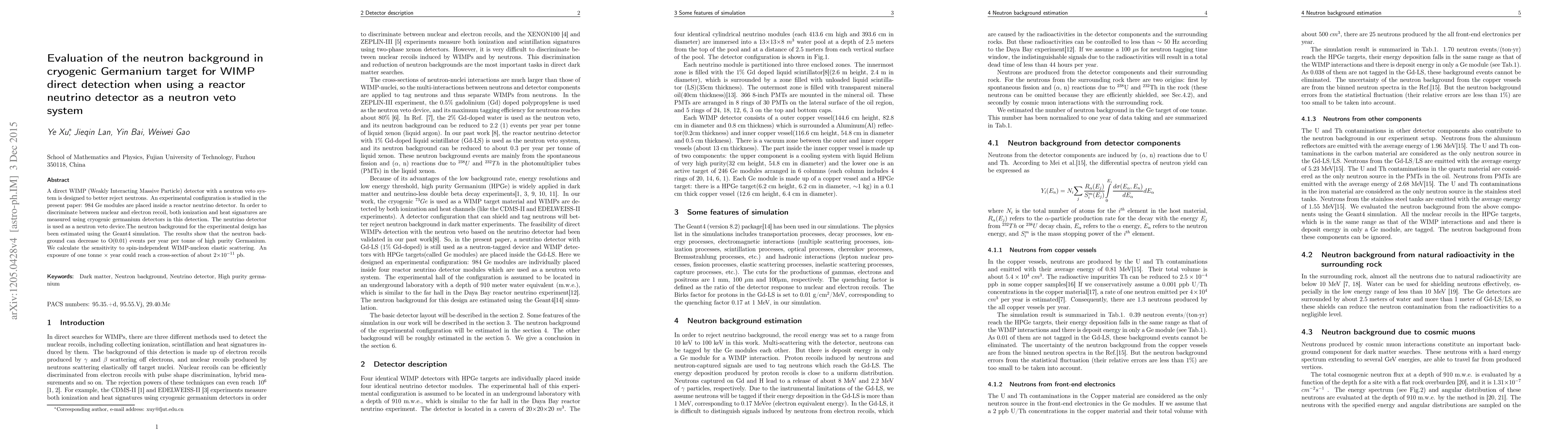 This paper evaluates the neutron background in cryogenic Germanium targets for WIMP detection, employing a reactor neutrino detector as a neutron veto system. The Geant4 simulation estimates a neutron background of O(0.01) events per year per tonne of Germanium, achieving a sensitivity to WIMP-nucleon scattering of 2×10^-11 pb with a one-tonne year exposure.