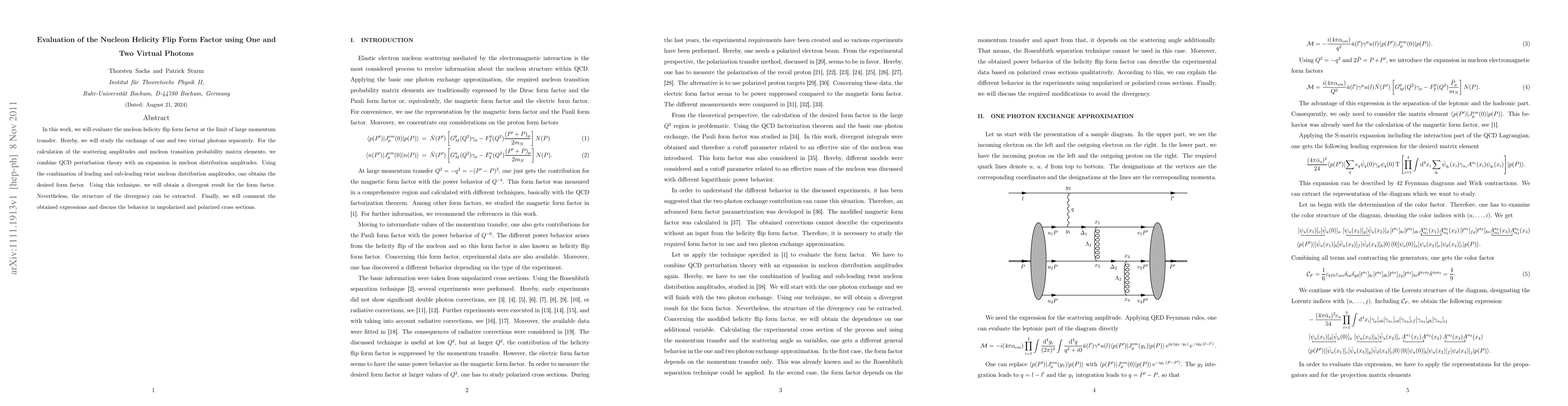 This paper evaluates the nucleon helicity flip form factor at high momentum transfer, analyzing the contributions from one and two virtual photons separately. The study combines QCD perturbation theory with nucleon distribution amplitudes, revealing a divergent result for the form factor, whose structure is extracted and discussed in relation to unpolarized and polarized cross sections.