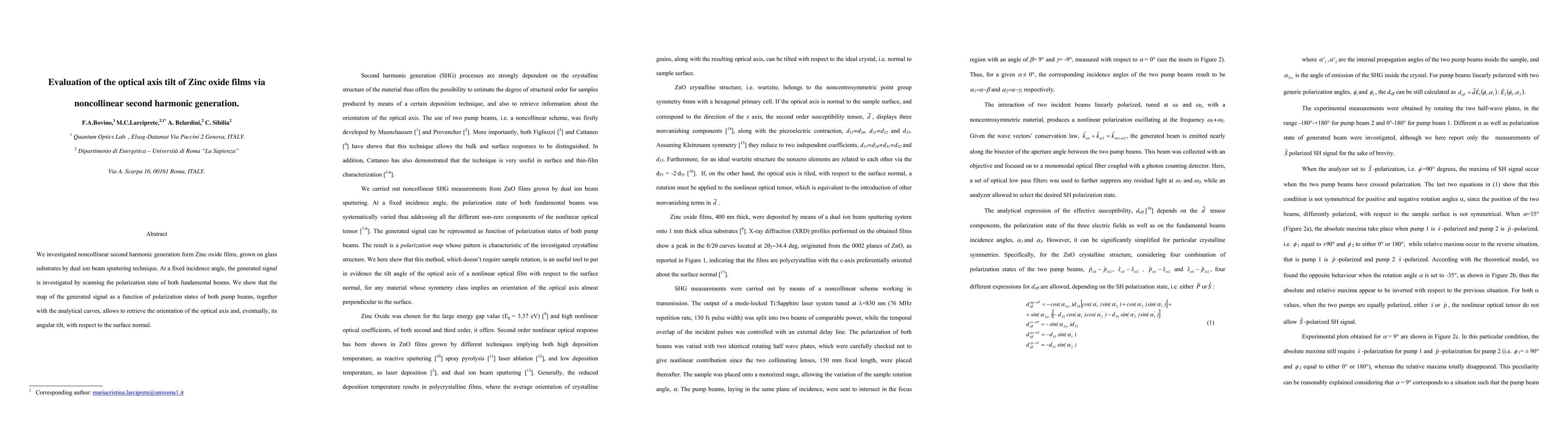 We investigated noncollinear second harmonic generation form Zinc oxide films, grown on glass substrates by dual ion beam sputtering technique. At a fixed incidence angle, the generated signal is investigated by scanning the polarization state of both fundamental beams. We show that the map of the generated signal as a function of polarization states of both pump beams, together with the analytical curves, allows to retrieve the orientation of the optical axis and, eventually, its angular tilt, with respect to the surface normal