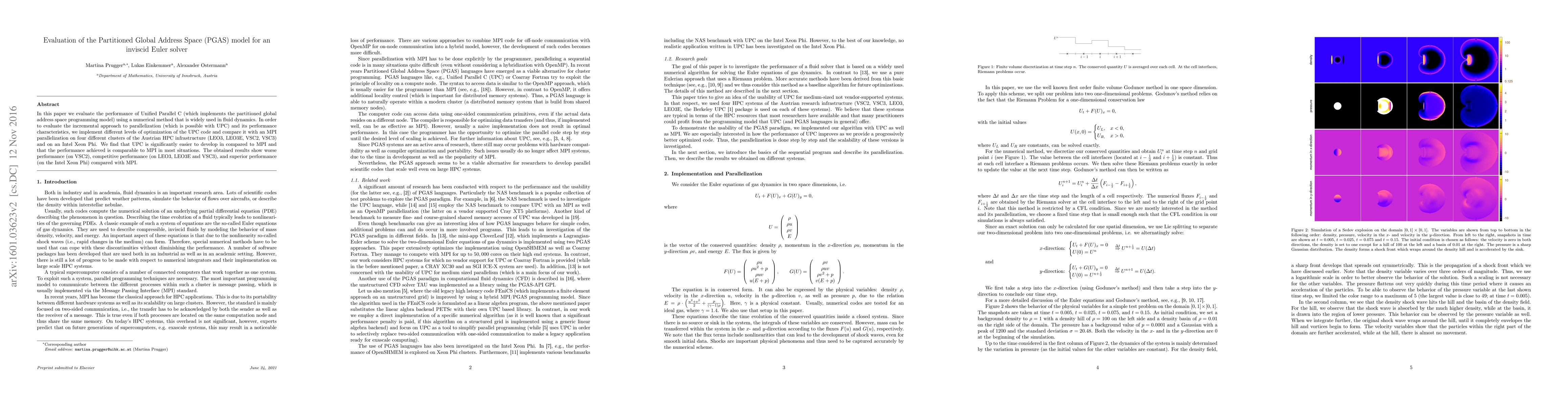 This paper evaluates the Unified Parallel C (UPC) implementation of the Partitioned Global Address Space (PGAS) model for an inviscid Euler solver, comparing it to MPI parallelization across various HPC clusters. Results indicate UPC is easier to develop and achieves comparable performance to MPI in most scenarios, with superior performance on the Intel Xeon Phi.