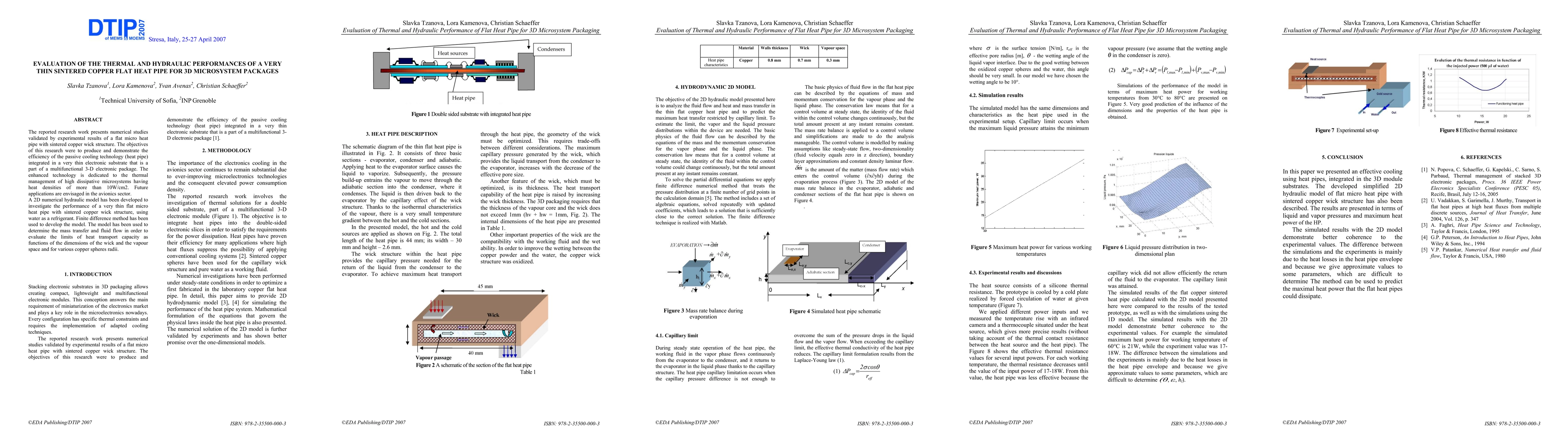 This paper evaluates a thin sintered copper flat heat pipe's thermal and hydraulic performance for 3D microsystem packages, using numerical simulations validated by experiments. The study aims to optimize passive cooling technology for high-dissipative microsystems, with potential applications in avionics.