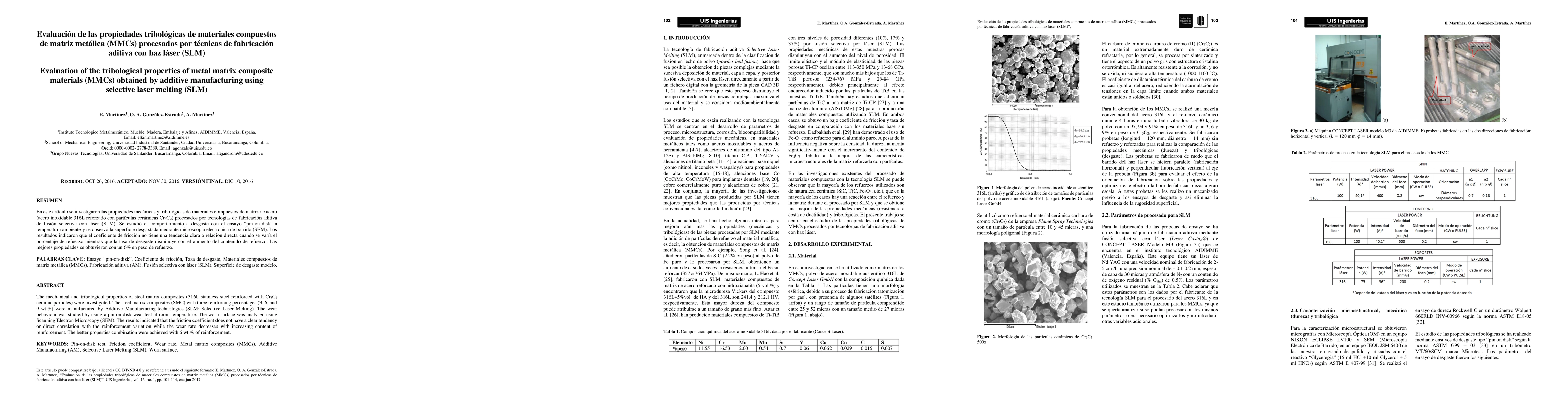 The mechanical and tribological properties of steel matrix composites (316L stainless steel reinforced with Cr3C2 ceramic particles) were investigated. The steel matrix composites (SMC) with three reinforcing percentages (3, 6, and 9 wt.%) were manufactured by Additive Manufacturing technologies (SLM: Selective Laser Melting). The wear behaviour was studied by using a pin-on-disk wear test at room temperature. The worn surface was analysed using Scanning Electron Microscopy (SEM). The results indicated that the friction coefficient does not have a clear tendency or direct correlation with the reinforcement variation while the wear rate decreases with increasing content of reinforcement. The better properties combination were achieved with 6 wt.% of reinforcement.
