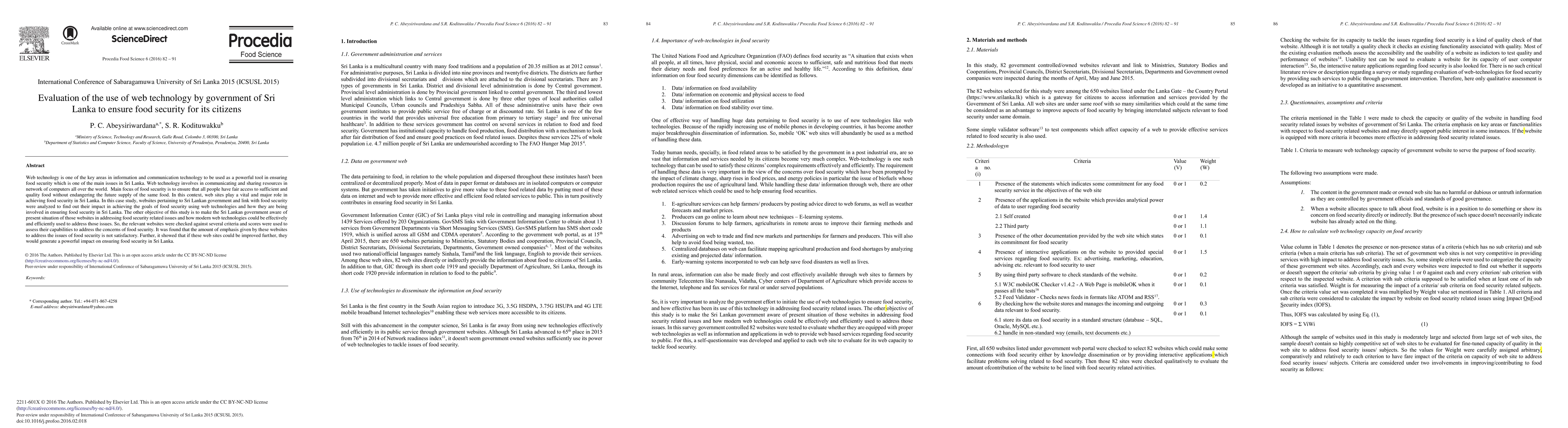This study evaluates the use of web technology by the Sri Lankan government to ensure food security, finding that current websites lack sufficient emphasis on addressing food security issues. Recommendations are made for improving these sites to better leverage modern web technologies for enhancing food security.