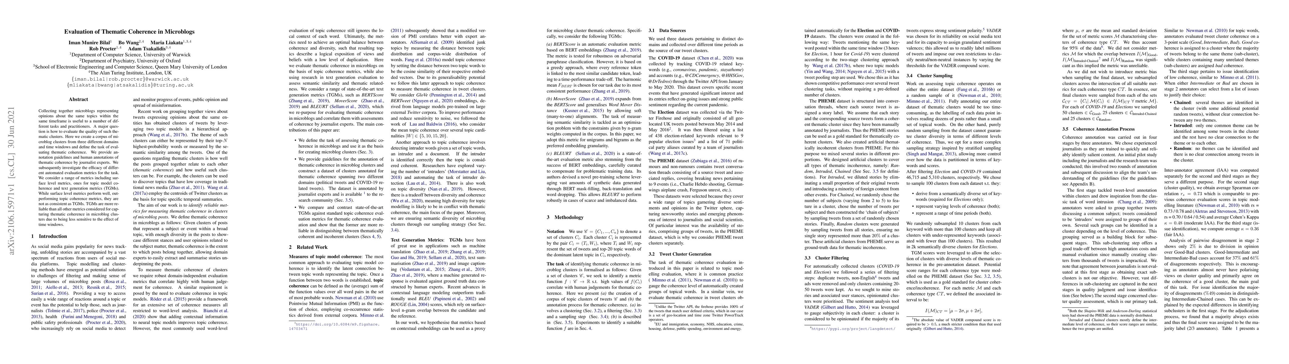 Collecting together microblogs representing opinions about the same topics within the same timeframe is useful to a number of different tasks and practitioners. A major question is how to evaluate the quality of such thematic clusters. Here we create a corpus of microblog clusters from three different domains and time windows and define the task of evaluating thematic coherence. We provide annotation guidelines and human annotations of thematic coherence by journalist experts. We subsequently investigate the efficacy of different automated evaluation metrics for the task. We consider a range of metrics including surface level metrics, ones for topic model coherence and text generation metrics (TGMs). While surface level metrics perform well, outperforming topic coherence metrics, they are not as consistent as TGMs. TGMs are more reliable than all other metrics considered for capturing thematic coherence in microblog clusters due to being less sensitive to the effect of time windows.