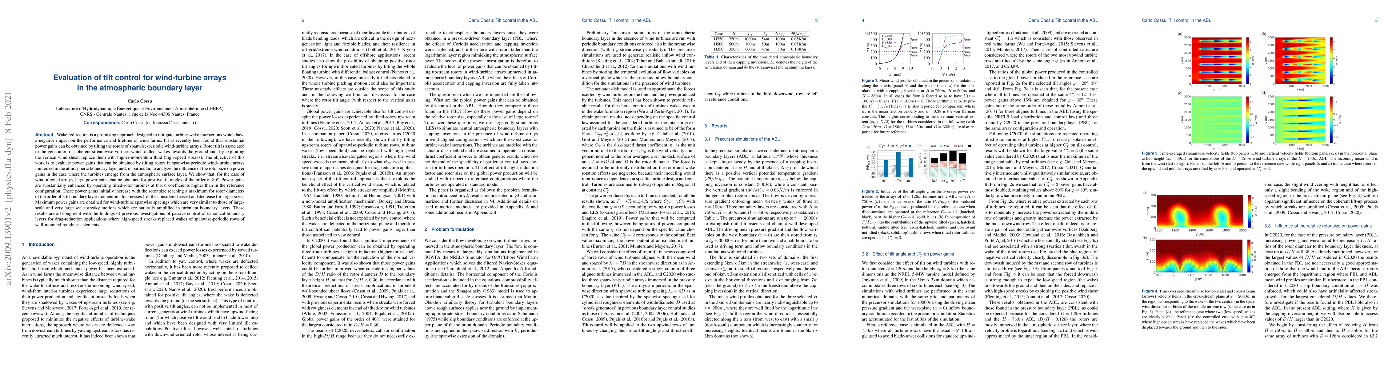This study evaluates the power gains from tilting rotors in wind-turbine arrays to mitigate wake interactions, finding significant gains for positive tilt angles around 30°. The power gains peak with rotor diameters around 3.6 boundary layer momentum thicknesses and decrease for larger sizes.