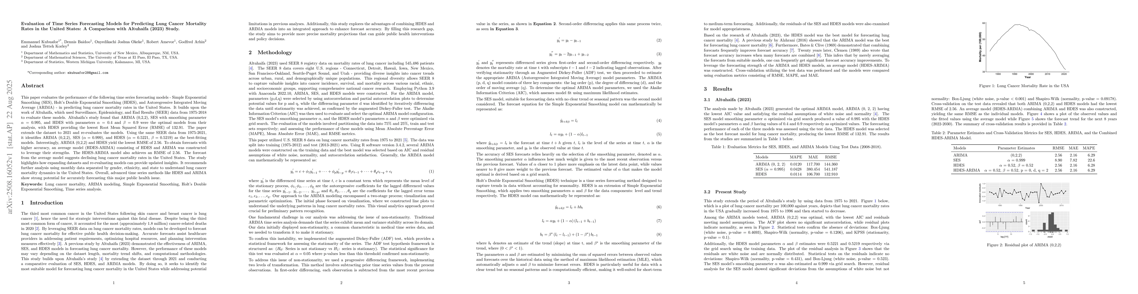 This paper evaluates the performance of the following time series forecasting models - Simple Exponential Smoothing (SES), Holt's Double Exponential Smoothing (HDES), and Autoregressive Integrated Moving Average (ARIMA) - in predicting lung cancer mortality rates in the United States. It builds upon the work of Altuhaifa, which used Surveillance, Epidemiology, and End Results (SEER) data from 1975-2018 to evaluate these models. Altuhaifa's study found that ARIMA (0,2,2), SES with smoothing parameter $\alpha=0.995$, and HDES with parameters $\alpha=0.4$ and $\beta=0.9$ were the optimal models from their analysis, with HDES providing the lowest Root Mean Squared Error (RMSE) of 132.91. The paper extends the dataset to 2021 and re-evaluates the models. Using the same SEER data from 1975-2021, it identifies ARIMA (0,2,2), SES ($\alpha=0.999$), and HDES ($\alpha=0.5221$, $\beta=0.5219$) as the best-fitting models. Interestingly, ARIMA (0,2,2) and HDES yield the lowest RMSE of 2.56. To obtain forecasts with higher accuracy, an average model (HDES-ARIMA) consisting of HDES and ARIMA was constructed to leverage their strengths. The HDES-ARIMA model also achieves an RMSE of 2.56. The forecast from the average model suggests declining lung cancer mortality rates in the United States. The study highlights how expanding datasets and re-evaluating models can provide updated insights. It recommends further analysis using monthly data separated by gender, ethnicity, and state to understand lung cancer mortality dynamics in the United States. Overall, advanced time series methods like HDES and ARIMA show strong potential for accurately forecasting this major public health issue.