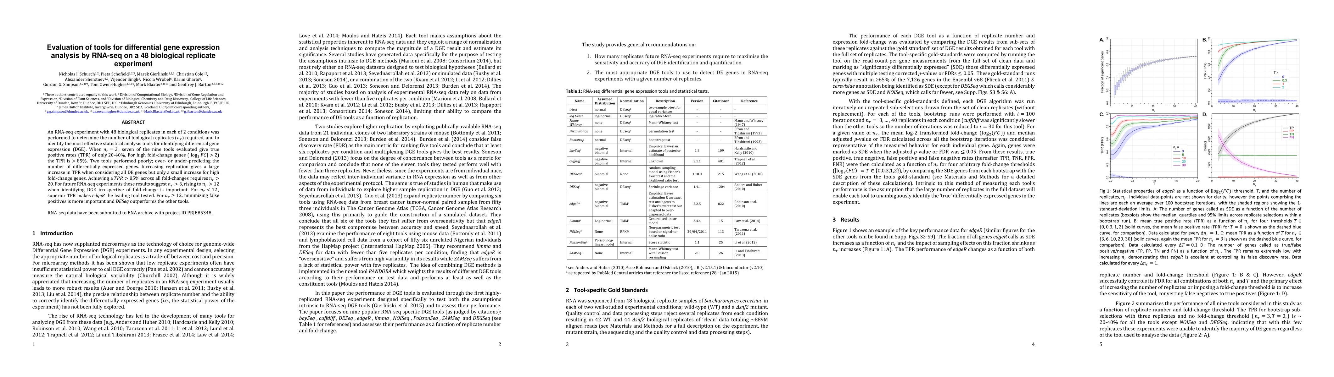This study evaluates nine tools for differential gene expression analysis using RNA-seq data from 48 biological replicates. It finds that achieving high true positive rates (TPR) requires more than 20 replicates, with edgeR performing best for 6 to 12 replicates and DESeq for 12 or more, emphasizing the importance of replication for accurate analysis.