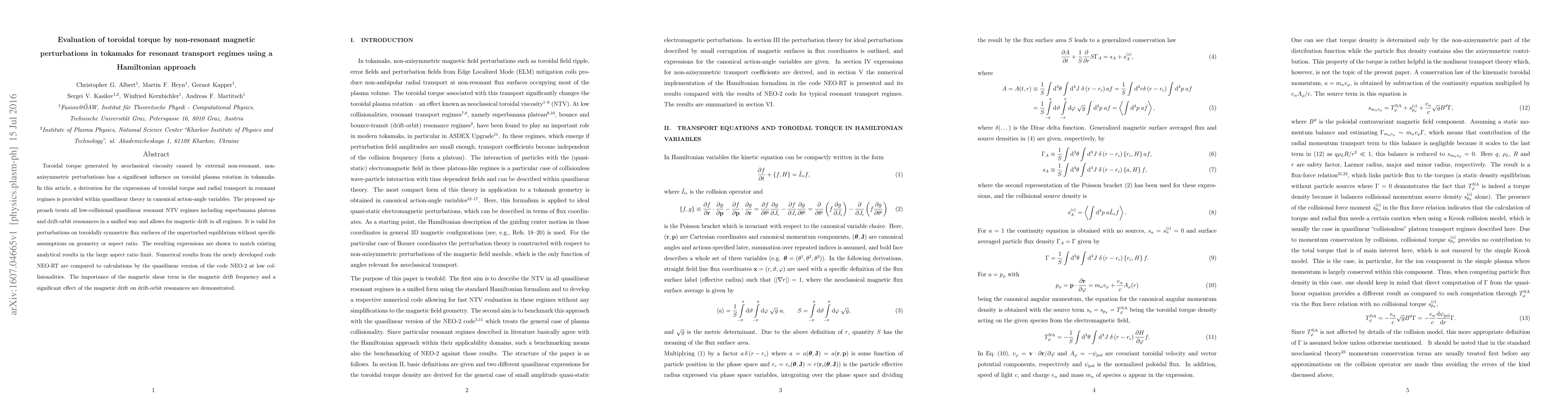 This paper evaluates toroidal torque in tokamaks due to non-resonant magnetic perturbations using a Hamiltonian approach, providing expressions for toroidal torque and radial transport in resonant regimes. The study unifies treatment of quasilinear resonant neoclassical viscosity regimes and validates the approach with existing analytical results and numerical comparisons.