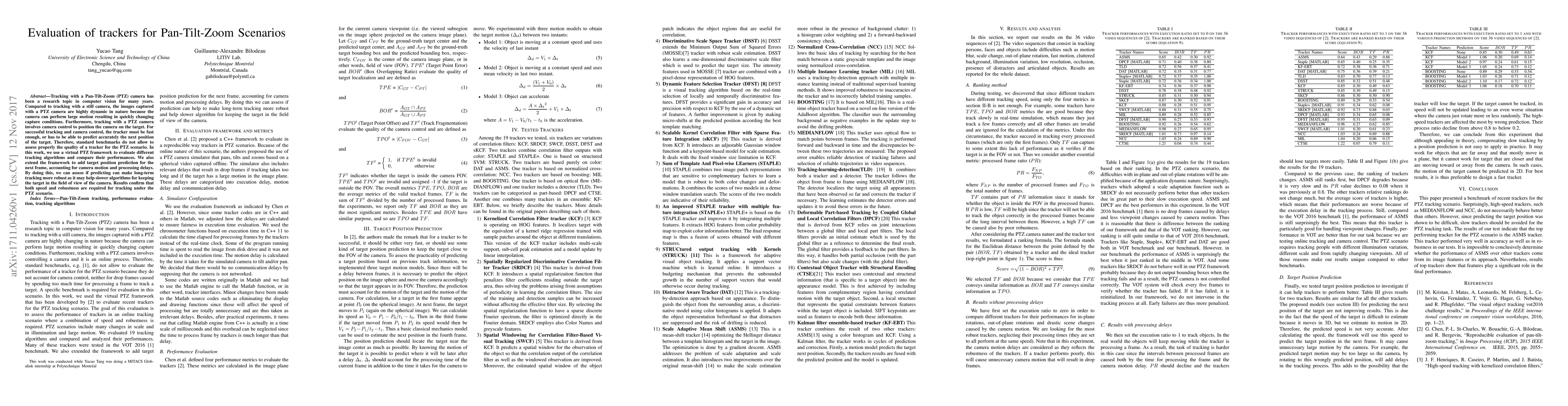 This paper evaluates various tracking algorithms for Pan-Tilt-Zoom (PTZ) camera scenarios, highlighting the need for both speed and robustness due to dynamic capture conditions. The study uses a virtual PTZ framework to compare performances and introduces target position prediction to enhance long-term tracking robustness.