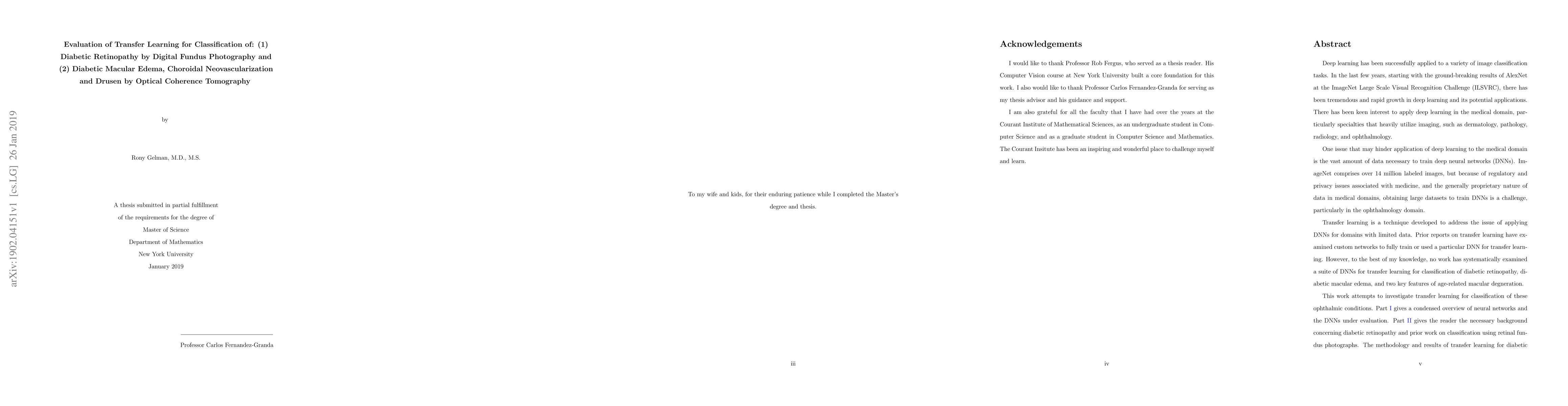This paper evaluates the effectiveness of transfer learning for classifying diabetic retinopathy via fundus photography and other ophthalmic conditions like diabetic macular edema, choroidal neovascularization, and drusen using optical coherence tomography. The study demonstrates that transfer learning is a feasible approach for achieving promising classification accuracy in domains with limited data.