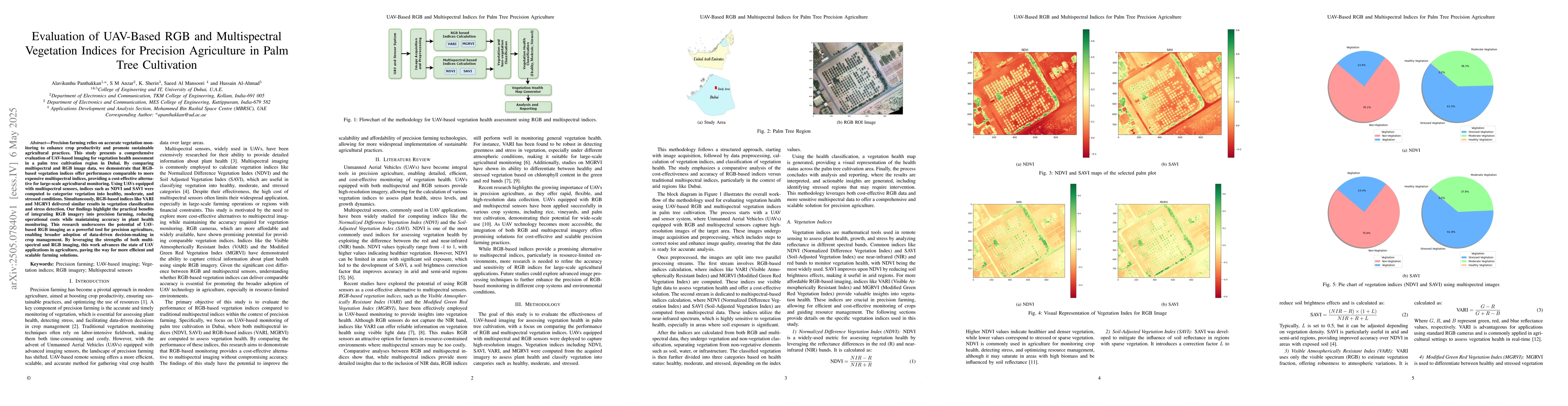 The study employed UAVs equipped with multispectral and RGB sensors to capture vegetation data in a palm tree cultivation region in Dubai. Vegetation indices such as NDVI, SAVI, VARI, and MGRVI were computed from the collected data to assess plant health and categorize it into healthy, moderate, and stressed conditions.