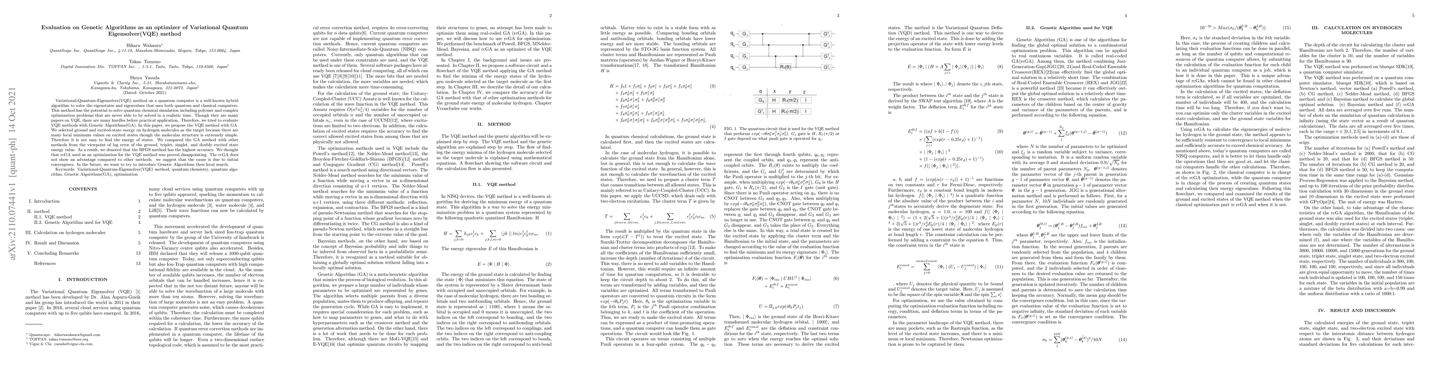 Variational-Quantum-Eigensolver(VQE) method on a quantum computer is a well-known hybrid algorithm to solve the eigenstates and eigenvalues that uses both quantum and classical computers. This method has the potential to solve quantum chemical simulation including polymer and complex optimization problems that are never able to be solved in a realistic time. Though they are many papers on VQE, there are many hurdles before practical application. Therefore, we tried to evaluate VQE methods with Genetic Algorithms(GA). In this paper, we propose the VQE method with GA. We selected ground and excited-state energy on hydrogen molecules as the target because there are many local minimum values on excited states though the molecular structure is extremely simple. Therefore it is not easy to find the energy of states. We compared the GA method with other methods from the viewpoint of log error of the ground, triplet, singlet, and doubly excited state energy value. As a result, we denoted that the BFGS method has the highest accuracy. We thought that rcGA used as an optimization for the VQE method was proved disappointing. The rcGA does not show an advantage compared to other methods. we suggest that the cause is due to initial convergence. In the future, we want to try to introduce Genetic Algorithms then local search.