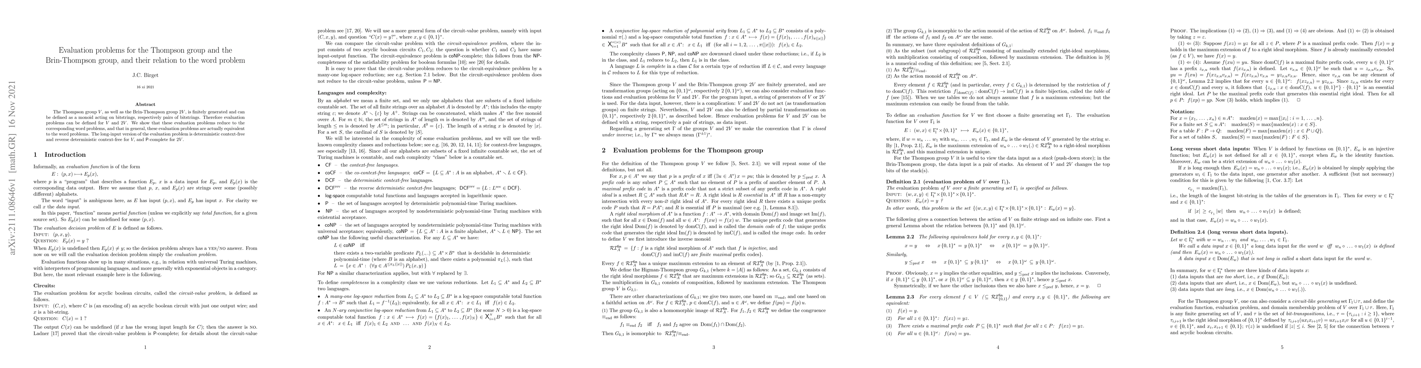 This paper explores evaluation problems for the Thompson group $V$ and the Brin-Thompson group $2V$, demonstrating their equivalence to the corresponding word problems. It finds that the long-input evaluation problem for $V$ is deterministic context-free and reverse deterministic context-free, while for $2V$ it is P-complete.